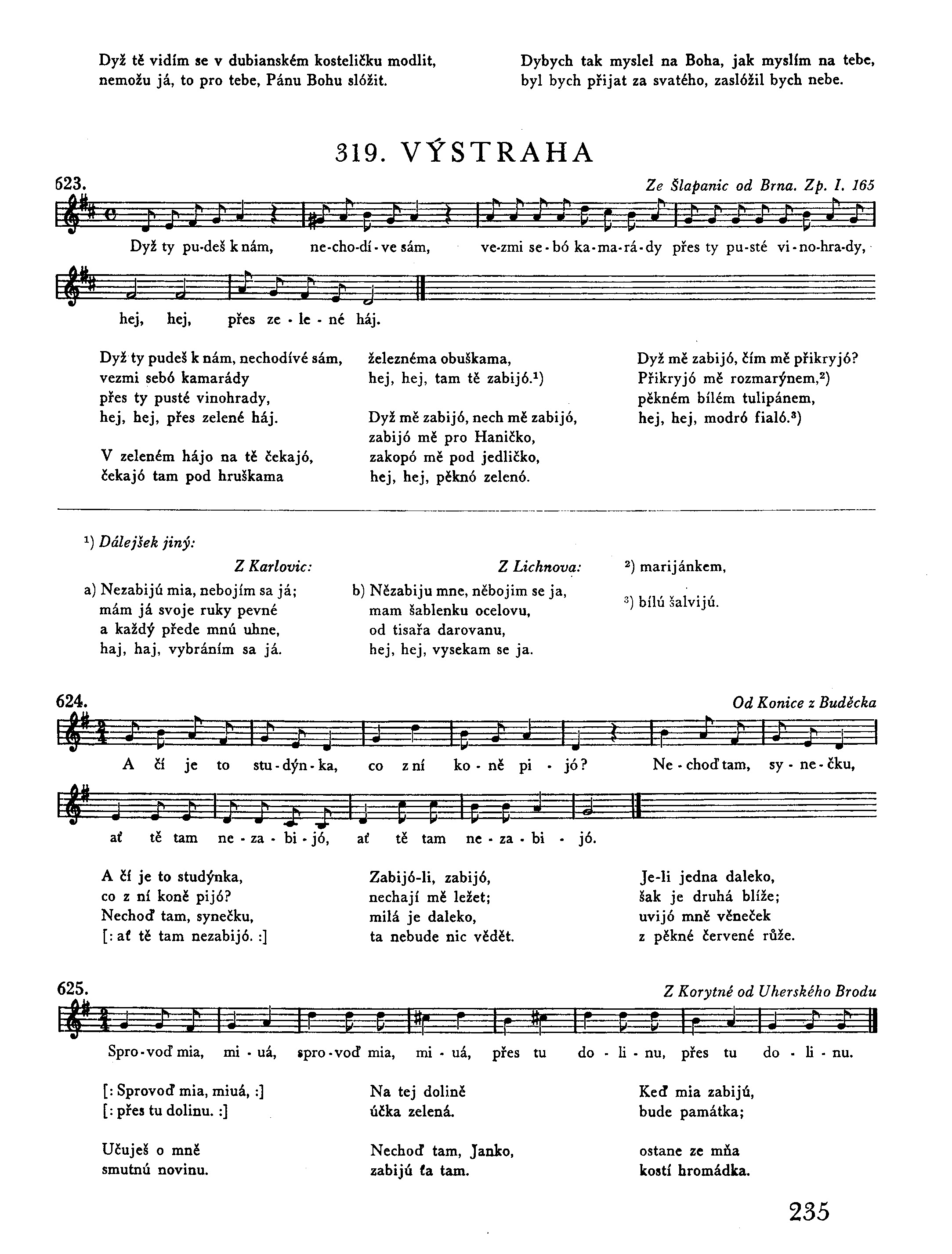 Dyž ty pudeš k nám, nechodívé sám, vezmi sebó kamarády přes ty pusté vinohrady, hej, hej, přes zelené háj. V zeleném hájo na tě čekajó, čekajó tam pod hruškama železnéma obuškama, hej, hej, tam tě zabijó.1) Dyž mě zabijó, nech mě zabijó, zabijó mě pro Haničko, zakopó mě pod jedličko, hej, hej, pěknó zelenó. Dyž mě zabijó, čím mě přikryjó? Přikryjó mě rozmarýnem,2) pěkném bílém tulipánem, hej, hej, modró fialó.3)