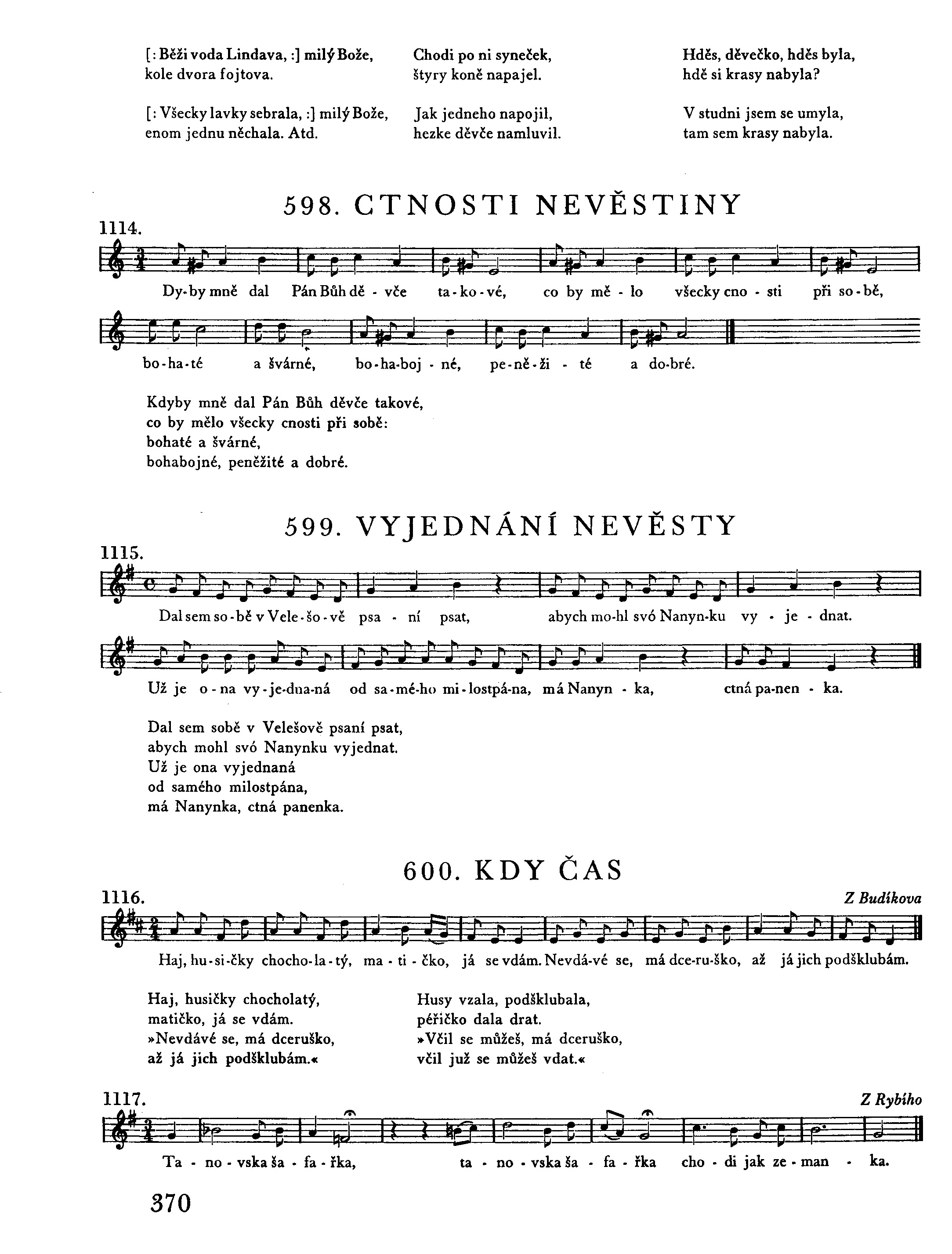 [: Hole, hole, můj kůň vrany, :] kostečkami vykladany. Co sem na nim jezdivaval, sveho ščesťa pohledaval. Měl sem ščesti i něščesti, potkalo mne děvče hezky. Děvče hezske, černooke a malučke, něvysoke. Začal sem se vyptavati, ma-li chuť se vydavati? Musiš byť ma, bys něchtěla, půjděm spolem do kostela. A v tym našim kosteličku podamy sobě ručičku. Ona prosi, že by rada, ale ji maměnka něda. Ale tatiček něbrani, esli je šuhajek švarny. Šuhaj švarny, černooky a malučky, něvysoky.