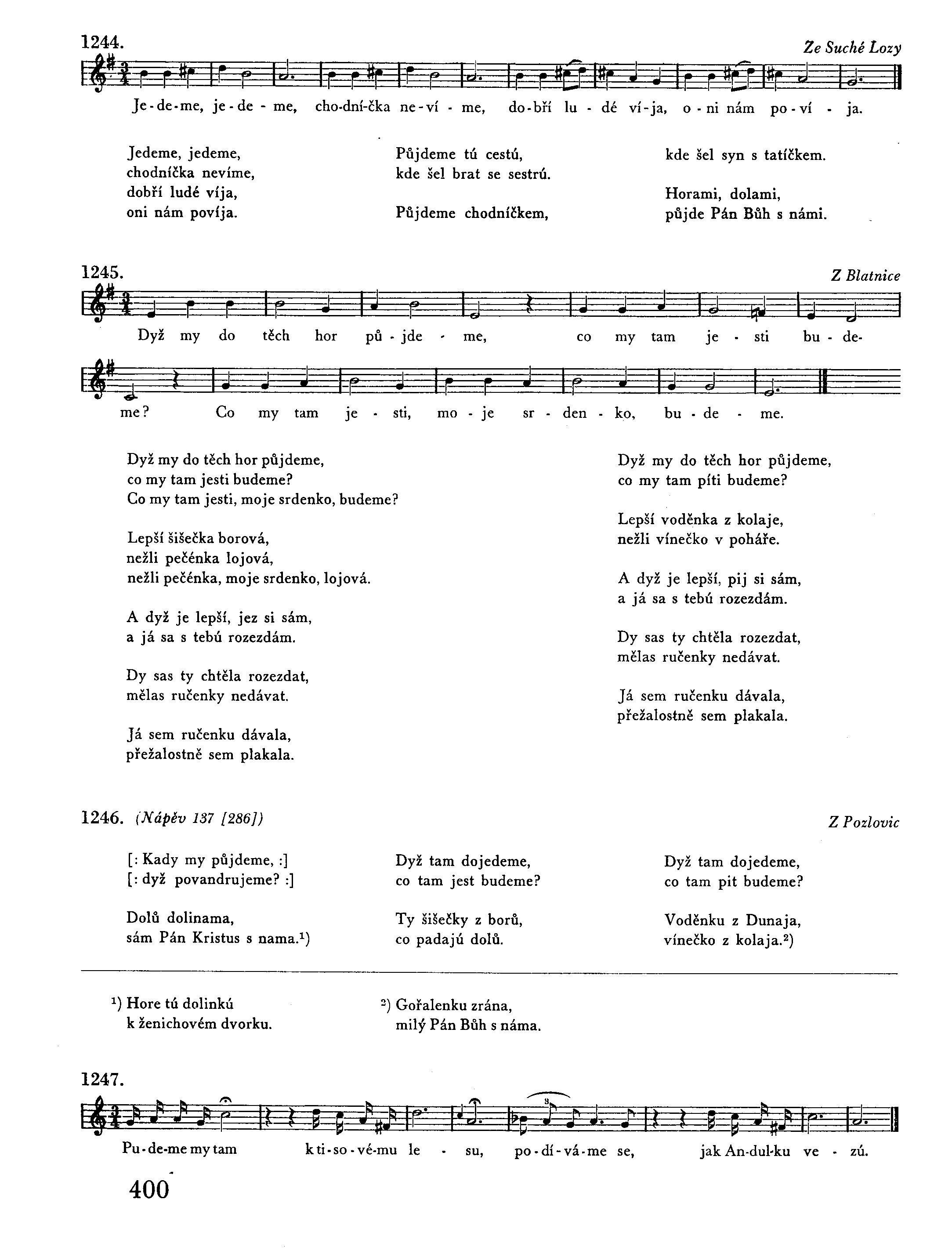 Pod jaborem za zeleným lesem, neví o mně můj tatíček, kde sem. Kdyby o mně můj tatíček věděl, on by pro mne na vozíčku přijel.1) A přijel by v pěkném komorníčku, a šuhajek na vraném koníčku. Pod šuhajkem vraný koník skáče a milenka přežalostně pláče.
