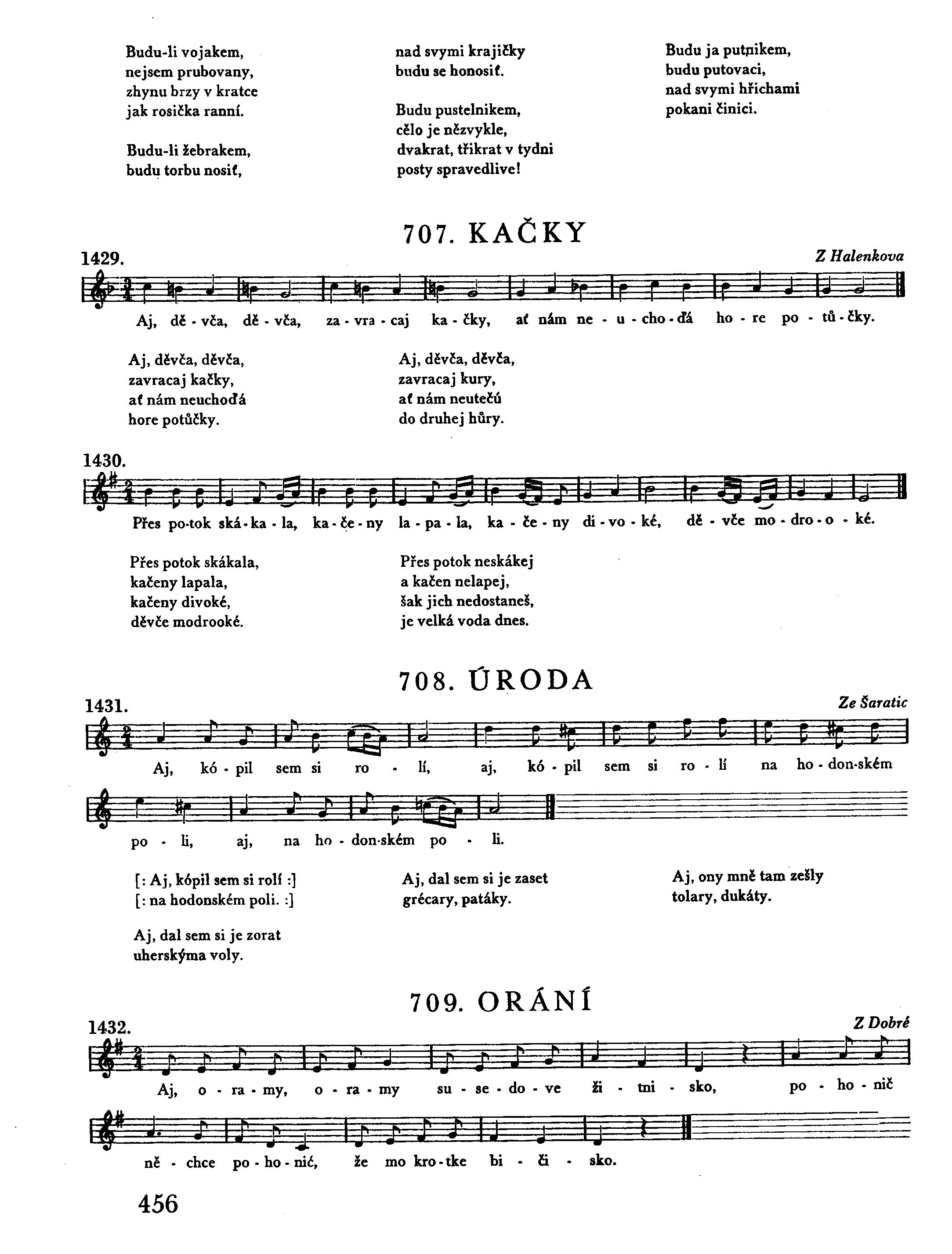1. [: Kúpíł sem si roľí :] [: v tom Holickém poli, :] [: dáł sem si ho zorat :] [: dvanásti bivoły. :] [: Dáł sem si ho zorat, :] [: aj sem si ho zaséł, :] [: hneď skoro z večera :] [: ľež měsíček zašéł. :] [: Aj sem si ho zaséł :] [: grajcary, patáky :] [: a ony mě zešły :] [: toraľe, dukáty. :] 2. [: Stavajú, stavajú, ;] [: šibeničky dvoje, :] [: vyber si, Janoško, :] [: keré budú tvoje :] [: Na keré ňa dajú, :] [: na tych budu visat, :] [: bude ně z hlavičky :] [: tuľipán vykvětat. :] [: Tuľipán, tuľipán, :] [: kedy ta trhat mám? :] [: Dočkaj do neděľe, :] [: až sa rozeleňám. :]