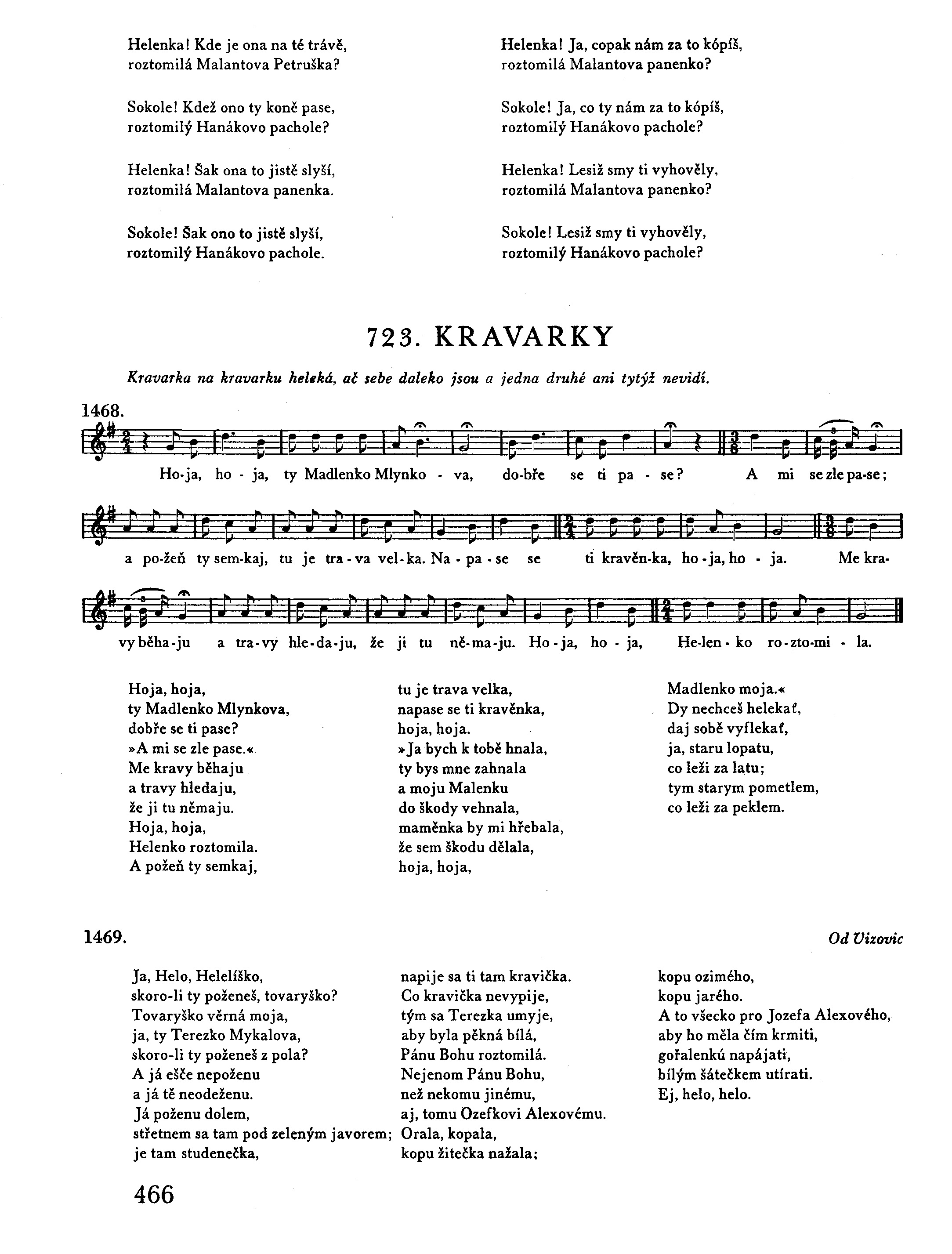 Hoja, hoja, ty Madlenko Mlynkova, dobře se ti pase? »A mi se zle pase.« Me kravy běhaju a travy hledaju, že ji tu němaju. Hoja, hoja, Helenko roztomila. A požeň ty semkaj, tu je trava velka, napase se ti kravěnka, hoja, hoja. »Ja bych k tobě hnala, ty bys mne zahnala a moju Malenku do škody vehnala, maměnka by mi hřebala, že sem škodu dělala, hoja, hoja, Madlenko moja.« Dy nechceš helekať, daj sobě vyflekať, ja, staru lopatu, co leži za latu; tym starym pometlem, co leži za peklem.
