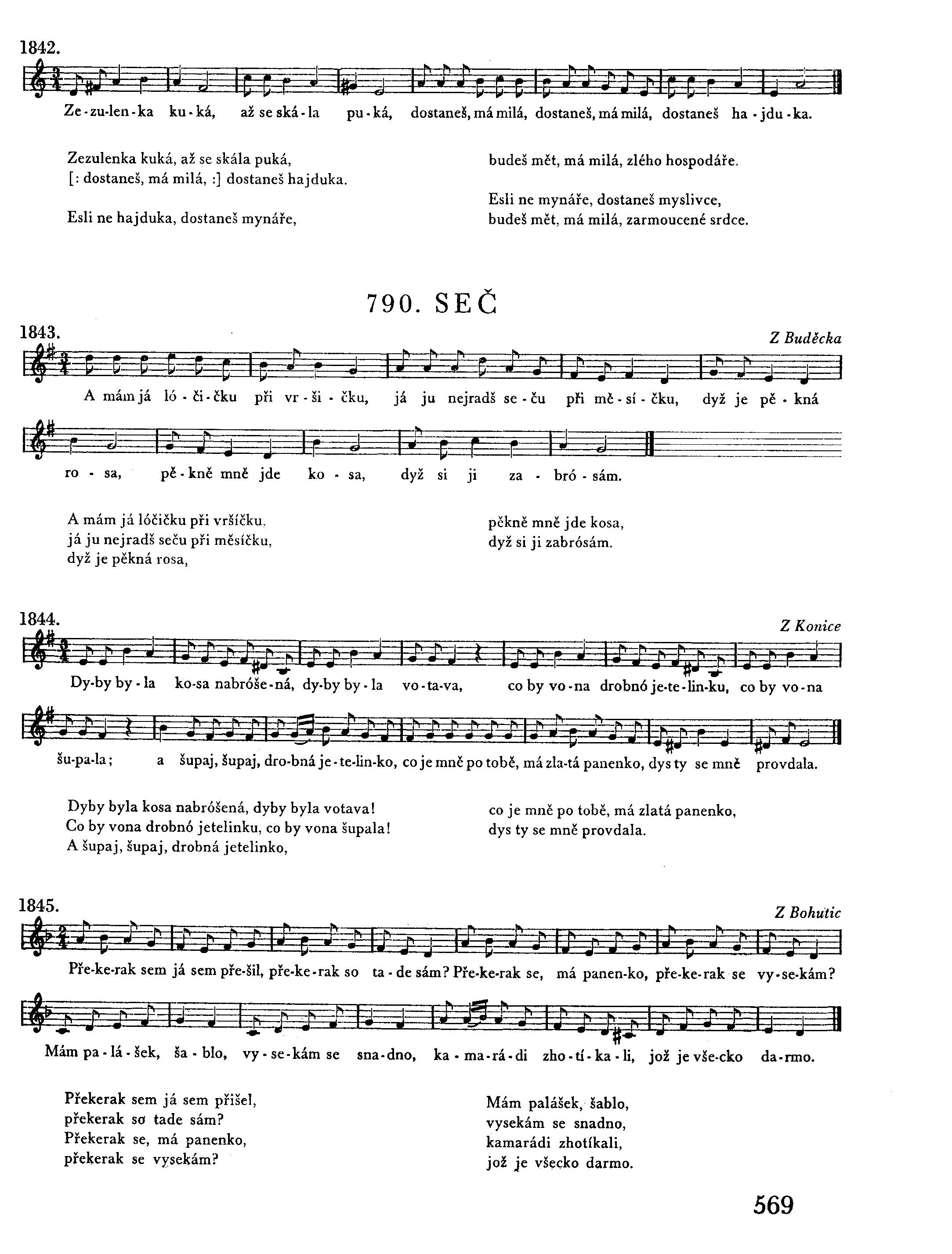 [: Na prahu tě stála, :] s mátí se žehnala. [: Žehné se ty sama, :] co sobě zvolila. [: Zvolila sem sobě :] to švarné pachole. [: Keré ráno stává, :] vraným koňom dává. [: Vraný koně řechcó, :] obroku jest nechcó. [: Jenom tó belenko, :] drobnó jetelinko. Co ju milá žala biléma rukama, žalostně plakala.