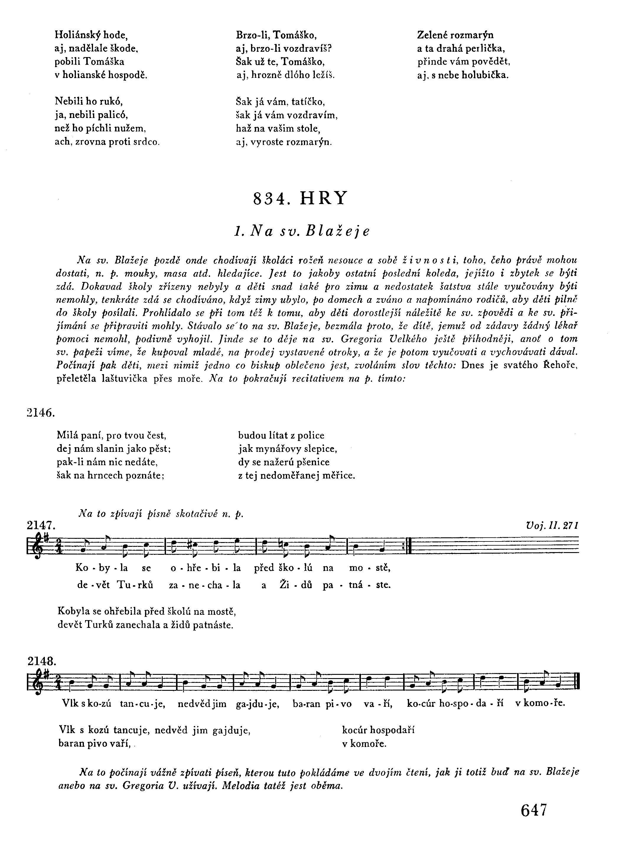 Dva kapuni, [: dva kapuni :] v stodole mlatěji,1) koleda, hej.2) Kokot věje, [: kokot věje, :] kura se mu směje. Koleda, hej. Kocur měři, kočka mišek drži. Baran veze do mlyna na voze. Koza mele, ovca muku seje. Kůň pec pali, kobyla mu chvali. Komar misi, muška vodu nosi. Huska bila, pecenečky vala. Hus sedlata,3) křidlem pec vymetá. Liška saže, zajic ji to maže. Vlk vybira, chleba něpřebyva. Vrana liči a na vilka křiči,4) počkej, vilku, na maličku chvilku. Vilk něčeka, do lesa utěka.