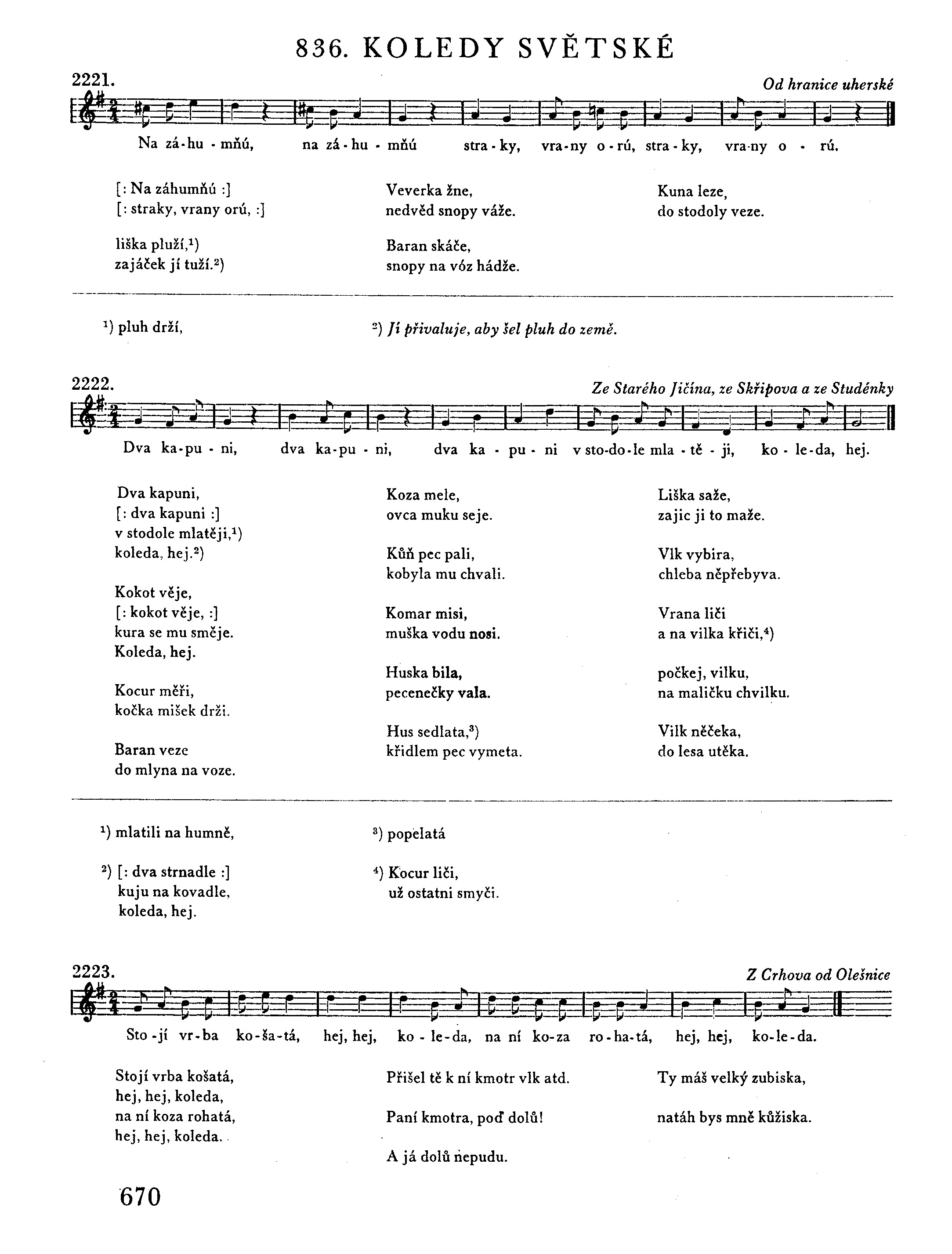 Dva kapuni, [: dva kapuni :] v stodole mlatěji,1) koleda, hej.2) Kokot věje, [: kokot věje, :] kura se mu směje. Koleda, hej. Kocur měři, kočka mišek drži. Baran veze do mlyna na voze. Koza mele, ovca muku seje. Kůň pec pali, kobyla mu chvali. Komar misi, muška vodu nosi. Huska bila, pecenečky vala. Hus sedlata,3) křidlem pec vymetá. Liška saže, zajic ji to maže. Vlk vybira, chleba něpřebyva. Vrana liči a na vilka křiči,4) počkej, vilku, na maličku chvilku. Vilk něčeka, do lesa utěka.
