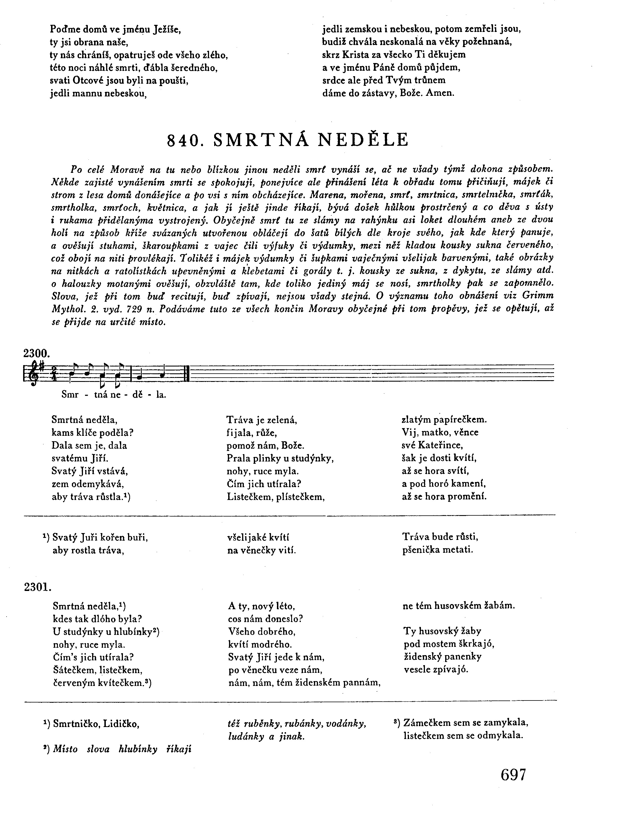 Smrtná neděla,1) kdes tak dlóho byla? U studýnky u hlubínky2) nohy, ruce myla. Čím’s jich utírala? Šátečkem, listečkem, červeným kvítečkem.3) A ty, nový léto, cos nám doneslo? Všeho dobrého, kvítí modrého. Svatý Jiří jede k nám, po věnečku veze nám, nám, nám, tém židenském pannám, * *) ne tém husovském žabám. Ty husovský žaby pod mostem škrkajó, židenský panenky vesele zpívájó.