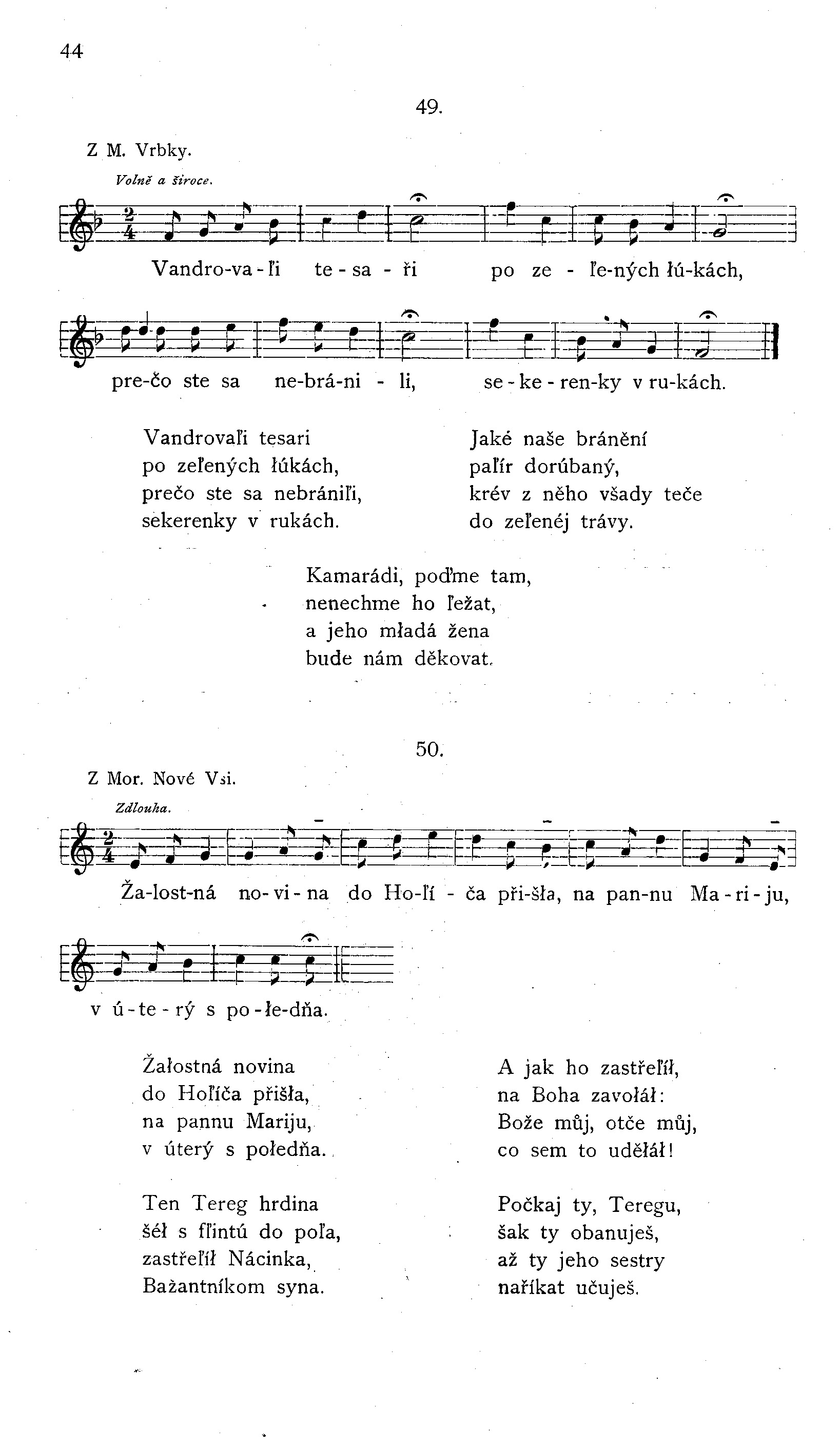Vandrovaľi tesaři po zeľených łúkách, prečo ste sa nebrániľi, sekerenky v rukách. Jaké naše bránění paľír dorúbaný, krév z něho všady teče do zeľenéj trávy. Kamarádi, poďme tam, nenechme ho ľežat, a jeho mładá žena bude nám děkovat.