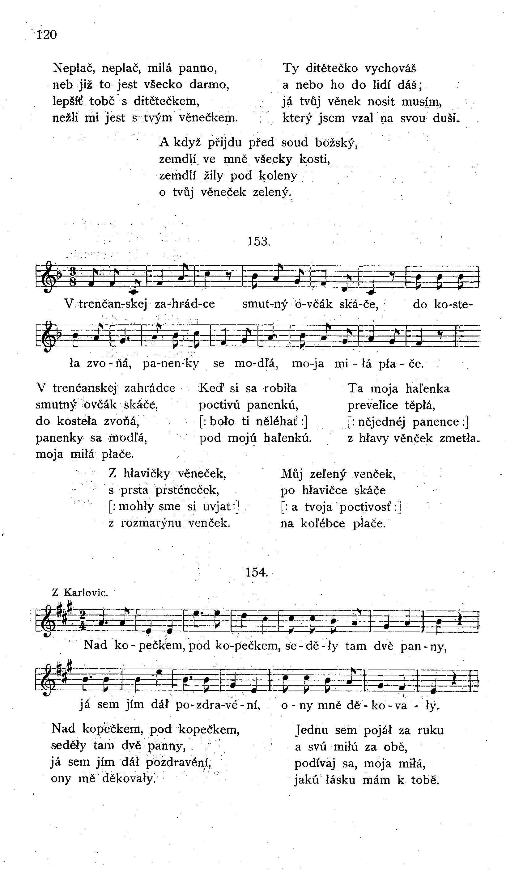 V trenčanskej zahrádce smutný ovčák skáče, do kosteła zvoňá, panenky sa modľá, moja miłá płače. Keď si sa robiła poctivú panenkú, [: boło ti něléhať :] pod mojú haľenkú. Ta moja haľenka preveľice těpłá, [: nějednéj panence :] z hłavy venček zmetła. Z hłavičky věneček, s prsta prsténeček, [: mohły sme si uvjat :] z rozmarýnu venček. Můj zeľený venček, po hłavičce skáče [: a tvoja poctivosť :] na koľébce płače.