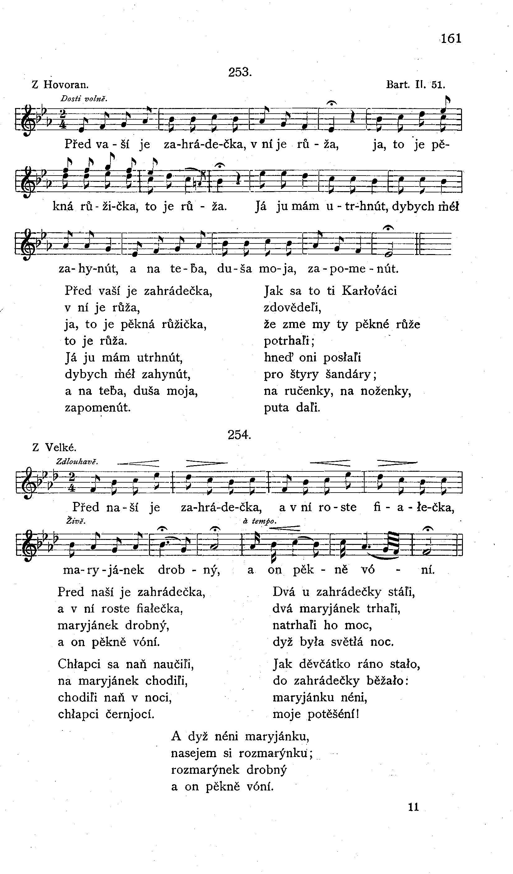 Seděla pod borovičkou, plakala, že má chudičkou kytičku rozmarínovou na zahrádce. Prosila božího deště, aby jí vyrostla ještě kytička rozmarinová na zahrádce. Mladost, radost! ani mně nedají dorost: včera mně minulo patnáct let, už jsem jich přelhala devět. Nedám, nedám, mládenci, to vám povídám, se stromu jablíčka trhali: musíte času čekati. Kdyby bylo nesvítalo, bylo by mi děvče dalo tři hubičky nebo čtyry, to je děvče roztomilý! Už jdou děvčátka z Lomečku, už jdou děvčata z Lomce: mají červeny čepení, mají zeleny věnce. Pověz mně, och má znejmilejší! kudy k vám budu chodit? Vokolo humen je cestička, ta tě k nám bude vodit. Vokolo humen je cestička, je pěkná drnovatá: kdy ty k nám, můj Honzíčku, pří-deš, sedni před naše vrata. Před těma našima vratami je pěknej bílej kámen: kdy ty k nám, můj Honzíčku, přídeš, jenom si sedni na něn. Před těma našima vratami je pěknej kameníček: aby vo tom lidi věděli, že jsi můj milovníček. Šafáři,[19] mlynáři! z vašeho dvora krásná osoba vychází. Jeníčku, bratříčku! nabí flintičku, postřel Aničku na hrázi. Nechám jí, neznám ji: ona mně koupí na pěkný šaty hedbáví. Já jí zas zlatý pás, stříbrný přazky, zlaty podvazky: „Tu máš, Ančičko, zlatá perličko! lásku zas.“ Adámku náš! co pak děláš? na lonce ti pasou,