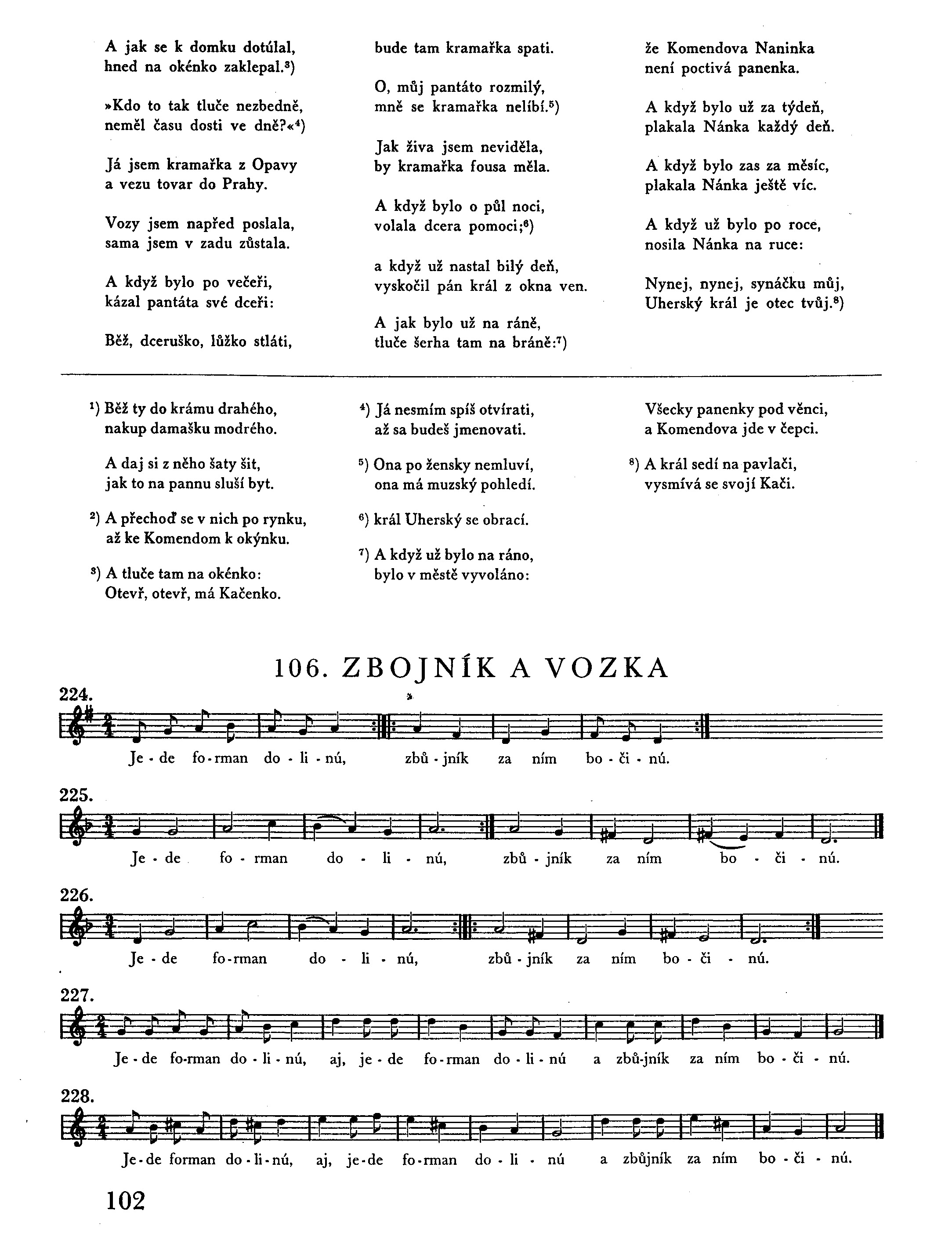 Jede forman dolinú, zbůjník za ním bočinú. Stůj, formane, nenáhlaj, vrané koně vypřahaj. Dy jsi ty tak velký pán, vypřahaj si koně sám. 1) Dyby bylo na poli, nebyl bych ti po vůli. Ale že je při horách, při zbojnických komorách. 2)