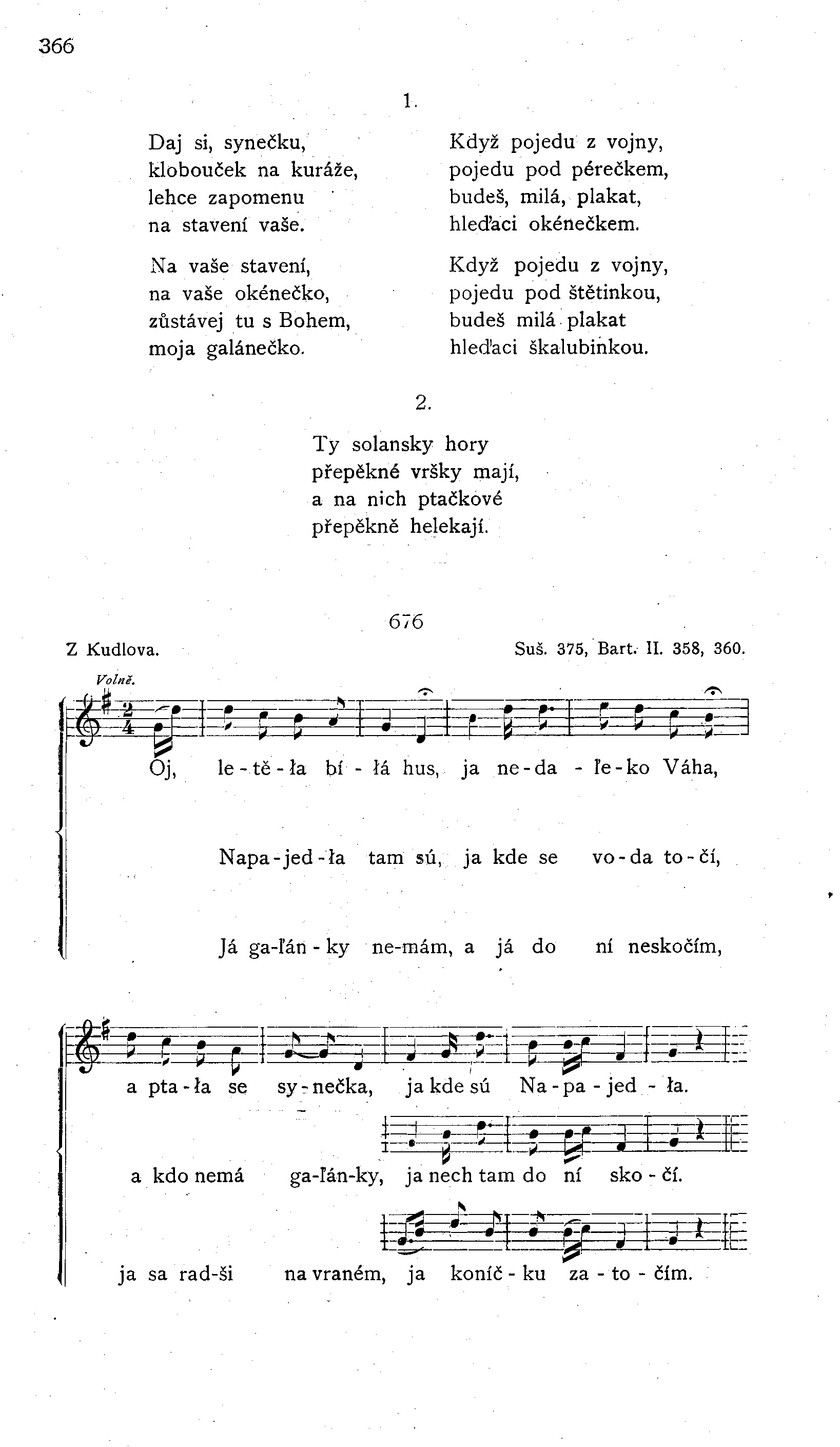 1. Poď sem, synečku, cosi ti povím, já sa ťa zeptám, koľik je hodin. Jedna hodina s půłnoci biła, dyž mňa má miłá vyprovodiła. Vyprovodiła až do hájíčka, tam sme słyšeľi zpívať słavíčka. Zpívaj, słavíčku, zpívaj veseľe že my budeme svoji manžełé. 2. Ach hory horečky, ach hora, hora, zpoza horečky cosi mňa vołá, ach vołá, vołá, gaľánka moja poď sem, synečku, sama su doma.