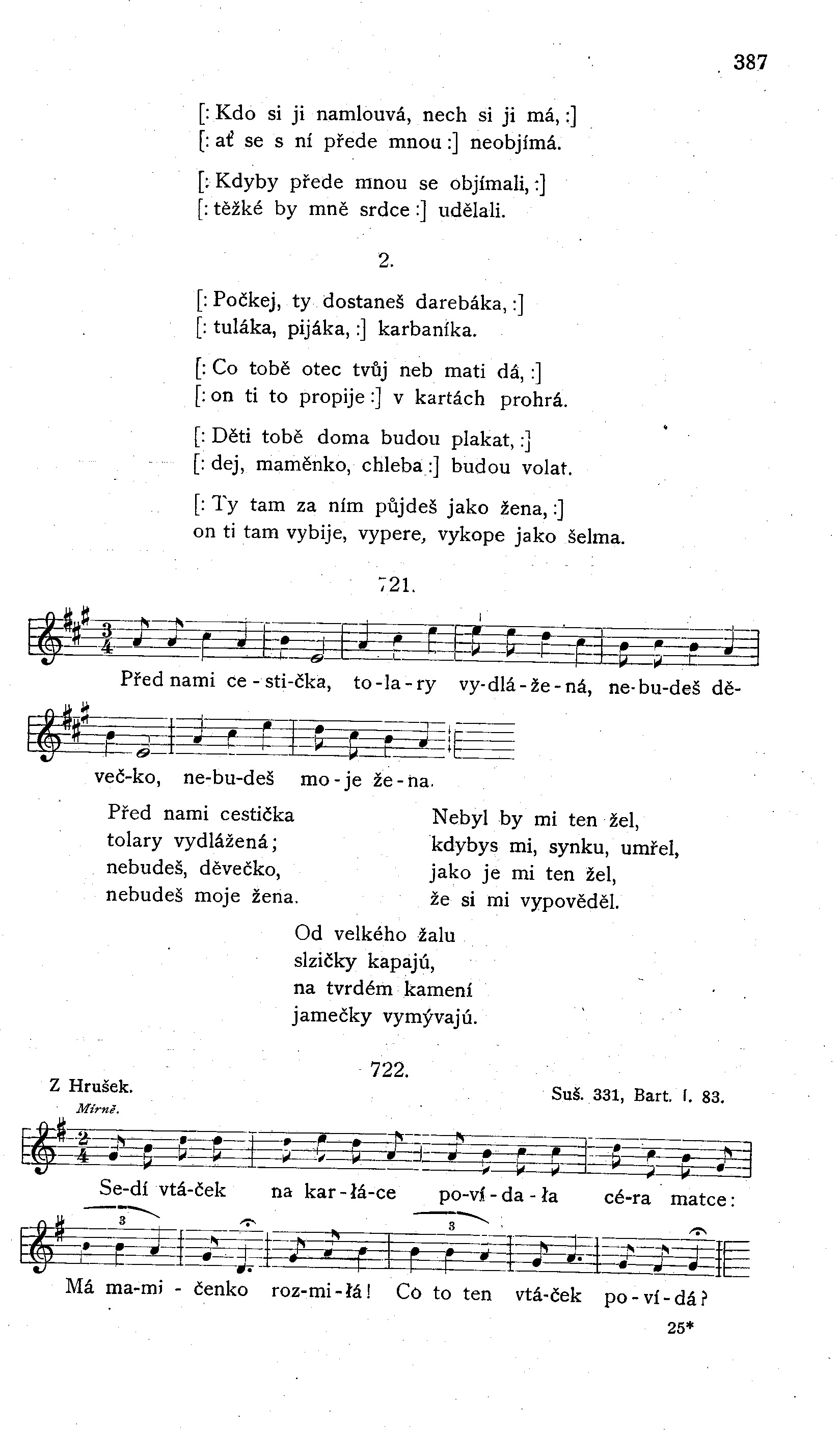 Sedí ptáček na kadlátce, žalovala dcera matce: Ach, mamko, mamko, mamko milá, už mi syneček vypovídá. Vypovídá, vypověděl, včera večer s jinú seděl. Viděla sem ho hen v hájičku, seděl tam s jinú na trávníčku. Seděl, dyž ho přinutila, mé srdečko zarmútila. Ach, jak mně to, jak líto bylo, až sa mně do plaču chcelo. Nevěř, děvče, chlapcom nevěř, na řičicu vody neměř. Řičica vody nedržívá,1) syneček pravdy nemluvívá.2)