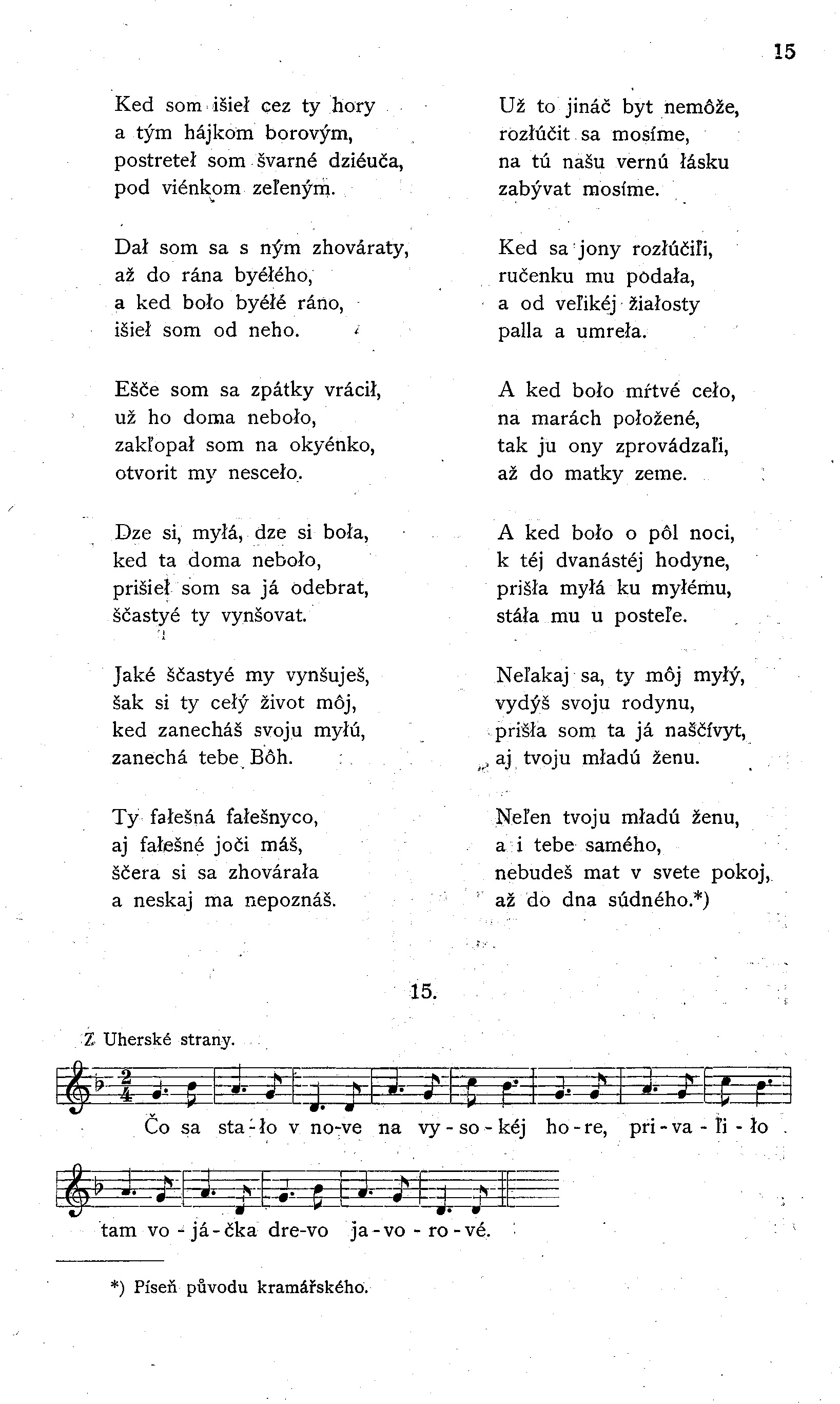 Co sa stało právě v Zemanovém dvore, vyrosteł rozmarýn výše okén hore. Néni to rozmarýn v zahradě saděný, ľež je to syneček doma vychovaný. Co sa stało právě v tem Ňorkovém dvore, vyrostła fijała výše okén hore. Néni to fijała v zahradě saděná, ľež je to Kačenka doma vychovaná. V tem Ňorkovém dvori borověnka stójí, ten synek Zemanů vyťat sa ju strójí. Do tu borověnku by sa strójił vyťat, nájprv si ju mosí od rodičů pýtat. Já sem si ju pýtał, oni ně ju daľi, Šak sa ti, Janíčku, nevýzhováraľi *). Děkuju ti. miłý, za tvoje chodění, ja že's nám ušľapał chodník prede dvermi. Ne tak prede dvermi jak na dołu dvorem, šak sa ně, můj miłý, dobre chodí po něm. A já tobě, miłá, za tvoju dobrotu, že's ně otvírała kažďunkú sobotu. Kažďunkú sobotu, sedumkrát za týdeň, možeš miłá vědět, že je to každý deň.