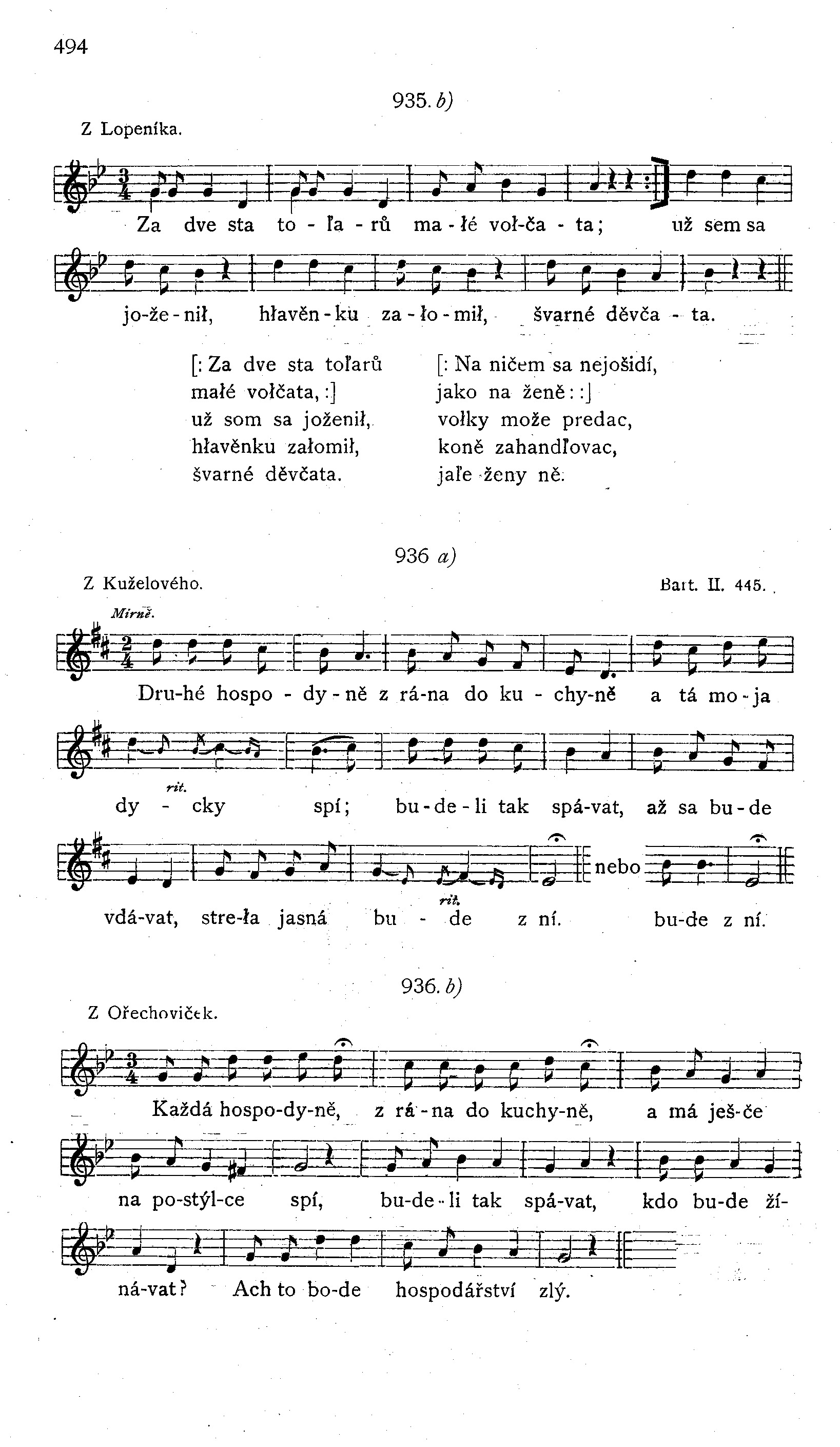 Ty Pavlovsky zvony, ony pěkně zvoní, [: už tobě, dceruško, vínek z hlavy zhodí. :] Zlomí ti ho, zlomí, devítima koni, [: nemáš ty sedávať s mládenci jinými. :] Darmo ti plakati, darmo naříkati, [: už se ti věneček víckrát nenavrátí. :] Že máš ty, synečku, máš: široký klobouk, [: nemožu já na tě, synku, zapomenout. :] Ide rok po roce a i po desíti, [: nemožu já na tě, synku, zapoměti. :] Proč ty se’s, děvečko, vdávala tak mladá? [: bude z tebe hospodyň, ospalá, nedbalá. :] Jedeme, jedeme, chodníčka nemáme, [: milé roztobože, kde my pobloudíme? :] Jedeme, jedeme, přes hory zeleny, budem si tam trhať maleny červeny. :] Maleny červeny, jahodečky zraly, [: už my si vezeme, to děvčátko švarny. :]