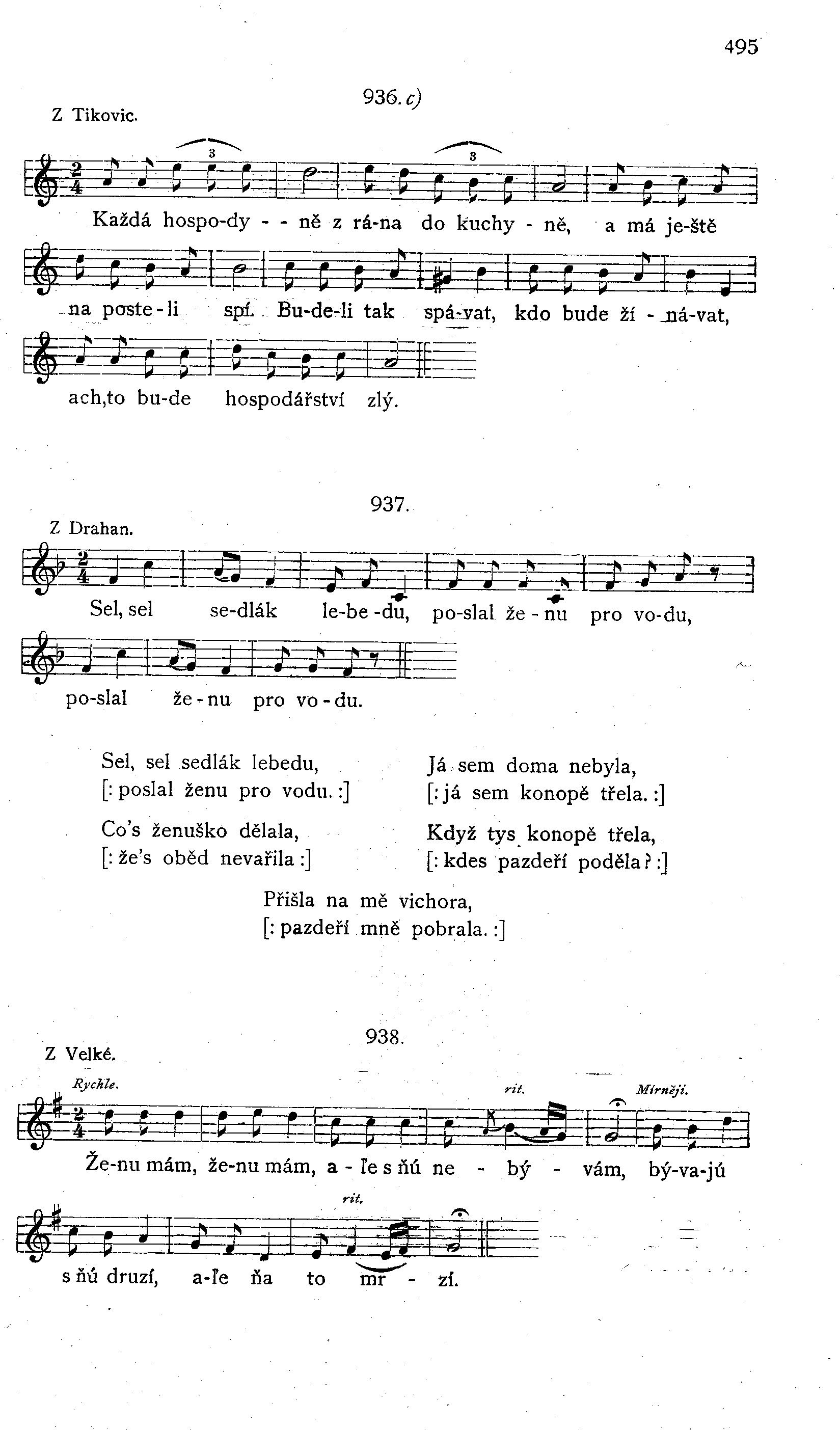 [: Sel sedláček lebedo :] [: na tom panským hódělo.1) :] Di, ženičko, di domo, hovař neco k vobědo. Sedlák jede z vorání, žena stává ze spání. Cos, ženičko, dělala, žes voběda nedala? Třela sem já konopě na té panské robotě. Des konopě potřela, kams pazdeří poděla? Strhla se tam víchora, pazdeří nám pobrala.2)