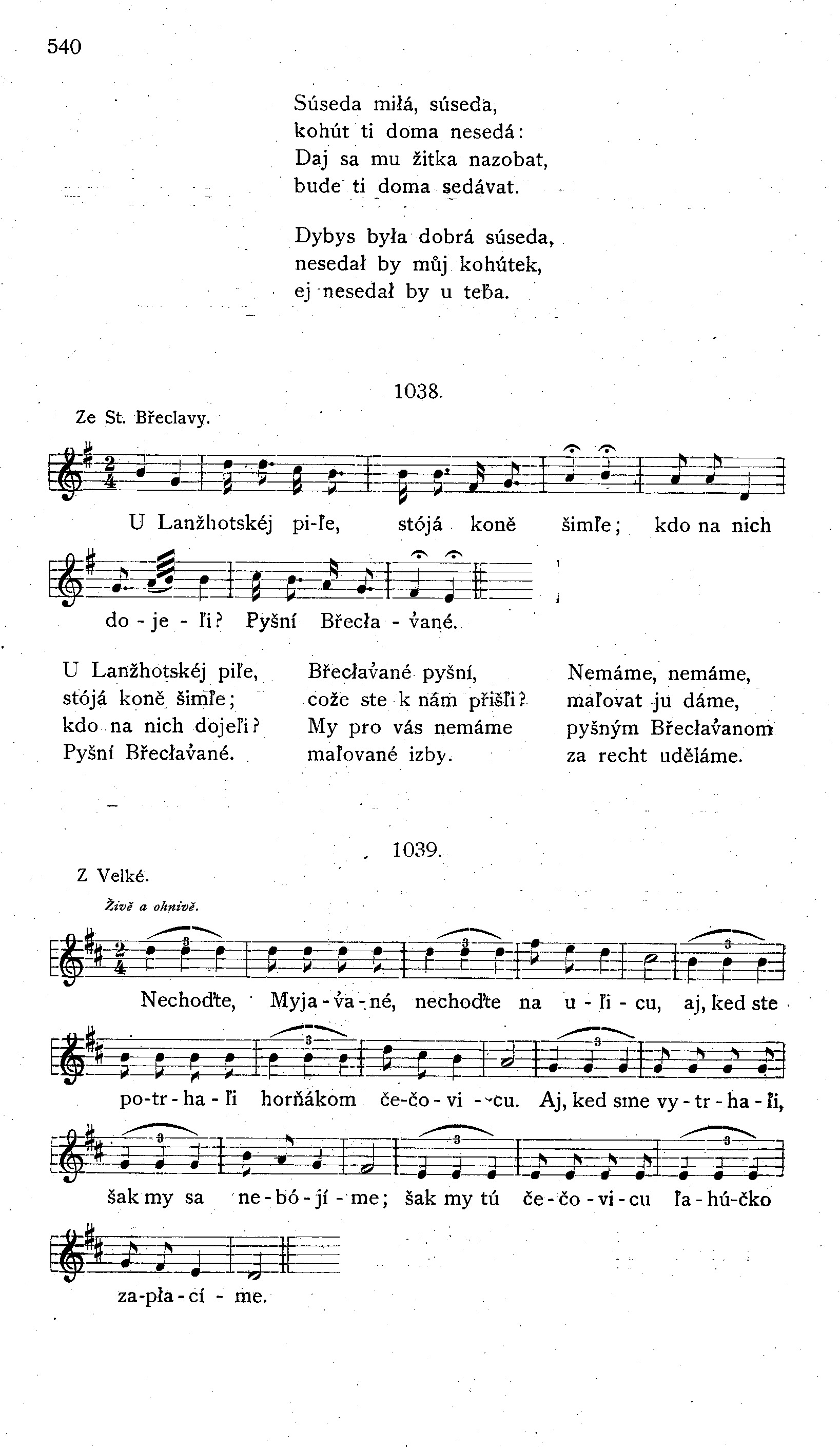 U Lanžhotskéj piľe, stójá koně šimľe; kdo na nich dojeľi? Pyšní Břecłav’ané. Břecłav’ané pyšní, cože ste k nám přišľi My pro vás nemáme maľované izby. Nemáme, nemáme, maľovat ju dáme, pyšným Břecłav’anom za recht uděláme.