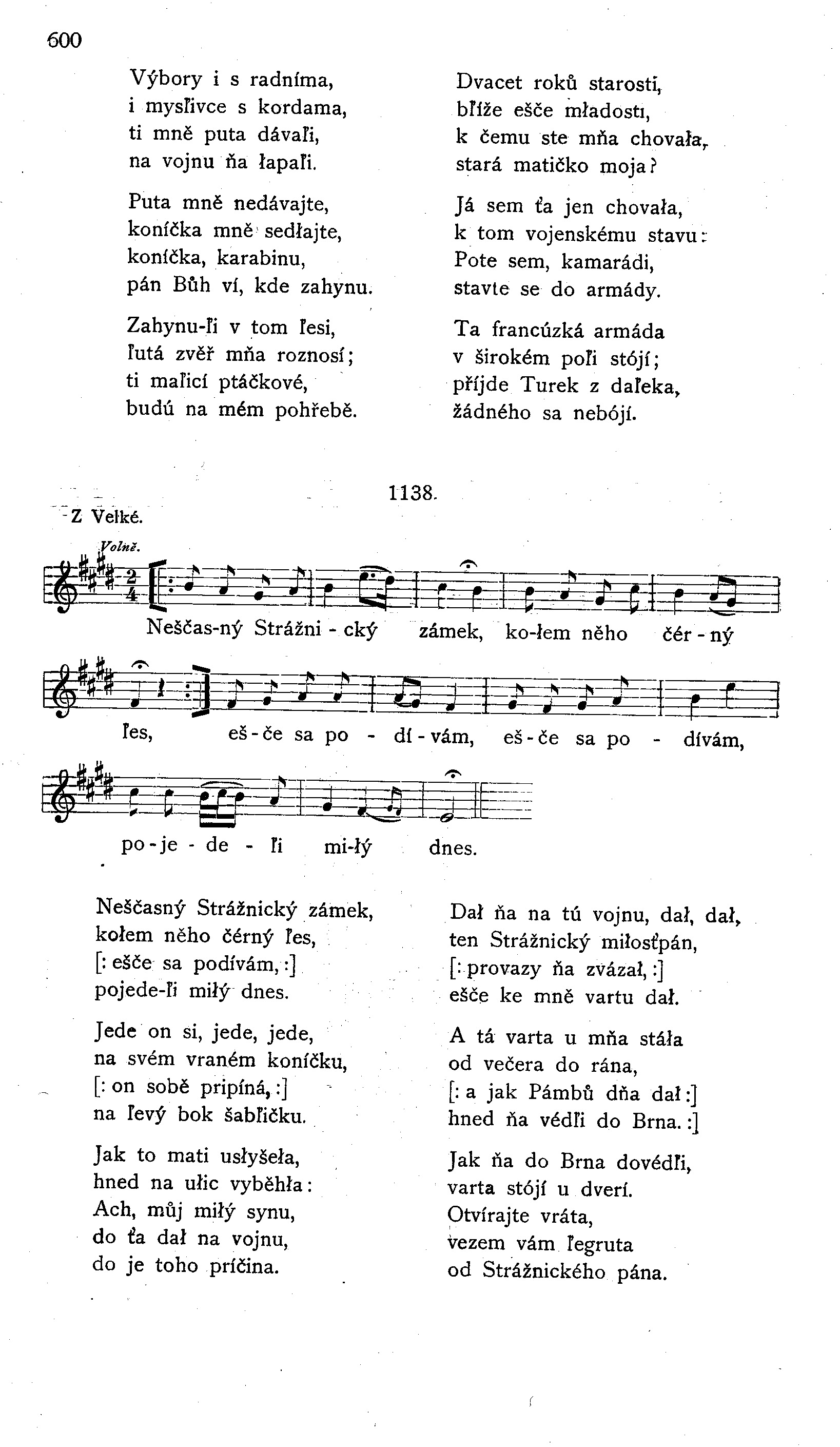 Neščasný Strážnický zámek, kołem něho čérný ľes, [: ešče sa podívám, :] pojede-ľi miłý dnes. Jeden on si, jede, jede, na svém vraném koníčku, [: on sobě pripíná, :] na ľevý bok šabľičku. Jak to mati usłyšeła, hned na ułic vyběhła: Ach můj miłý synu, do ťa dał na vojnu, do je toho príčina. Dał ňa na tú vojnu, dał, dał, ten Strážnický miłosťpán, [: provazy ňa zvázał, :] ešče ke mně vartu dal. A tá varta u mňa stáła od večera do rána, [: a jak Pámbů dňa dał, :] hned ňa védľi do Brna. Jak ňa do Brna dovédľi, varta stójí u dveri. Otvírajte vráta, vezem vám ľegruta od Strážnického pána.