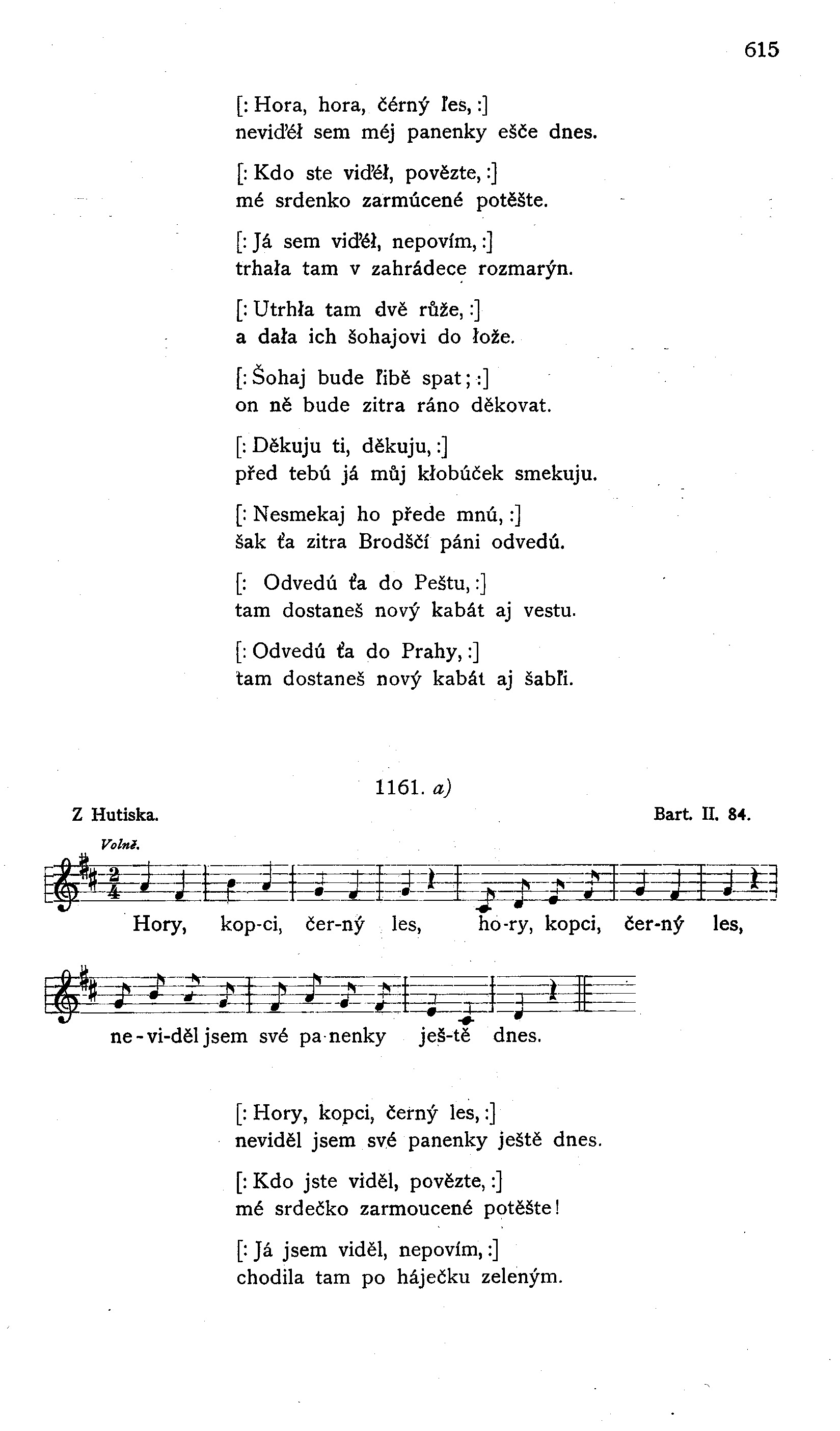 [: Hora, hora, čérný ľes, :] neviďéł sem méj panenky ešče dnes. [: Kdo ste viďéł, povězte, :] mé srdenko zarmúcené potěšte. [: Já sem viďéł, nepovím, :] trhała tam v zahrádece rozmarýn. [: Utrhła tam dvě růže, :] a dała ich šohajovi do łože. [: Šohaj bude ľibě spat; :] on ně bude zitra ráno děkovat. [: Děkuju ti, děkuju, :] před tebú já můj kłobúček smekuju. [: Nesmekaj ho přede mnú, :] šak ťa zitra Brodščí páni odvedú. [: Odvedú ťa do Peštu, :] tam dostaneš nový kabát aj vestu. [: Odvedú ťa do Prahy, :] tam dostaneš nový kabát aj šabľi.