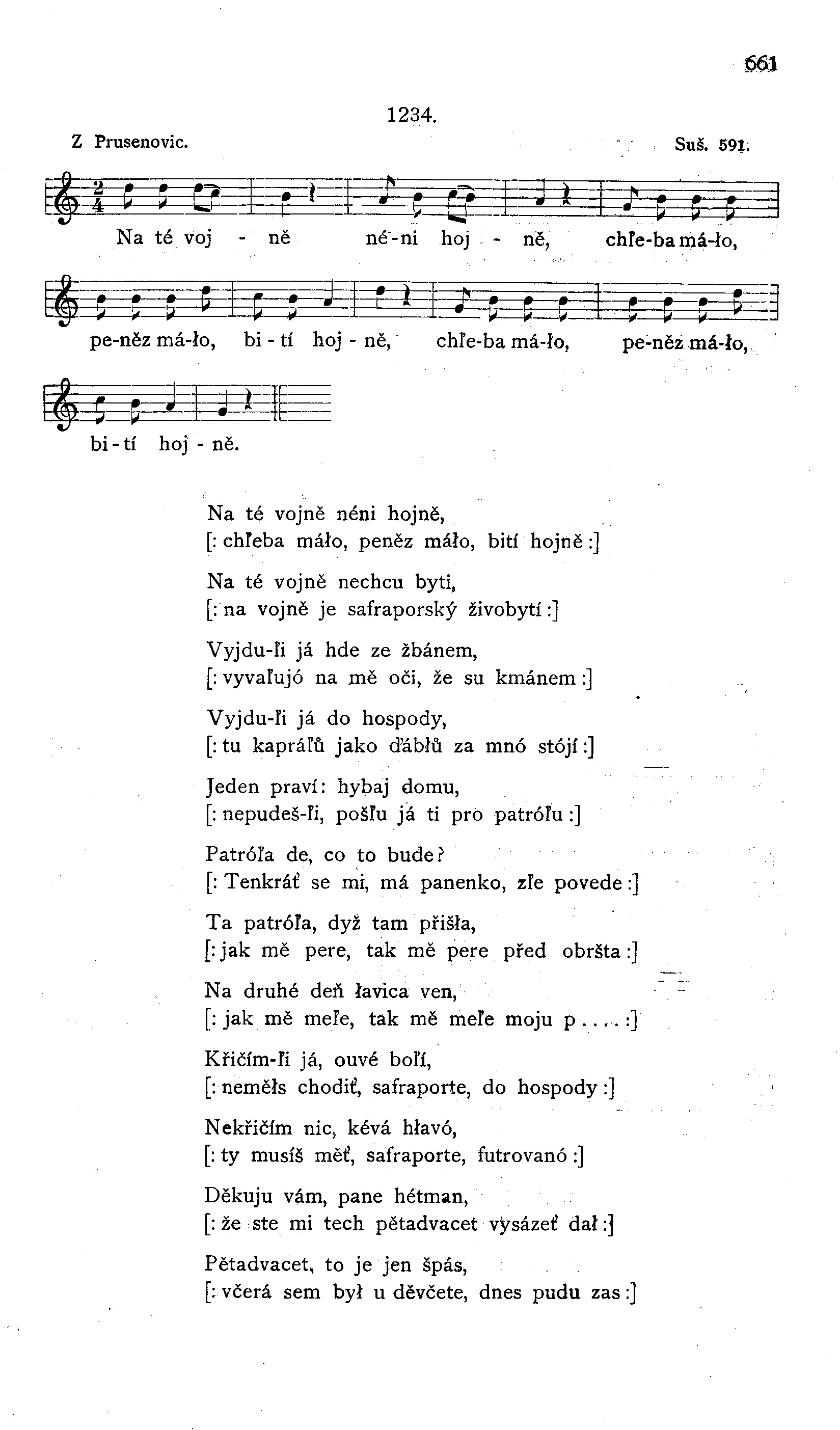Na té vojně néni hojně, [: chľeba málo, peněz máło, bití hojně :] Na té vojně nechcu byti, [: na vojně je safraporský živobytí :] Vyjdu-ľi já hde ze žbánem, [: vyvaľujó na mě oči, že su kmánem:] Vyjdu-ľi já do hospody, [: tu kaprálů jako ďábłů za mnó stojí :] Jeden praví: hybaj domu, [: nepudeš-ľi, pošľu já ti pro patróľu :] Patróľa de, co to bude? [: Tenkráť se mi, má panenko, zľe povede :] Ta patróľa, dyž tam přišła, [: jak mě pere, tak mě pere před obršta :] Na druhé deň łavica ven, [: jak mě meľe, tak mě meľe moju p ...... :] Křičím-ľi já, ouvé boľí, [: neměłs chodiť, safraporte, do hospody :] Nekřičím nic, kévá hłavó, [: ty musíš meť, safraporte, futrovanó :] Děkuju vám, pane hétman, [: že ste mi těch pětadvacet vysázeť dał :] Pětadvacet, to je jen špás, [: včerá sem był u děvčete, dnes pudu zas :]