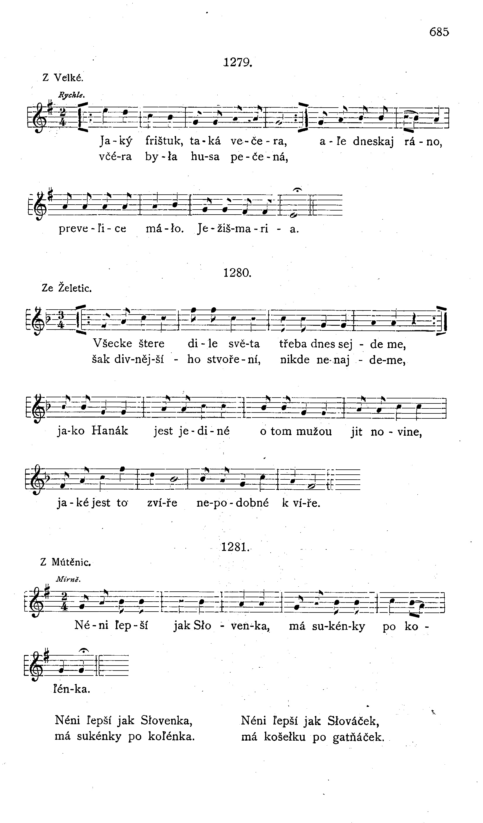 Já su malý žáček, zpívám jako vtáček. Ešče bych lépe zpíval, dybych žemličky s medem jídal. Ale já nemám hlasu, jídávám s olejem kašu. *) Já su malá panenka, chcu byt Kristova milenka. Ráda do kostela chodím, Pánu Bohu se tam modlím. **) Já su malá Apolenka, vyletěla sem z komínka. Lidé se mne polekali, na kolena poklekali, lidé se mne nelekejte, na kolena neklekejte. ***) O, Kriste králi, my žáci malí víme o tobě, žes přišel s nebe, stoupils k nám dolů, byls s námi spolu. Na zemi's bydlel, tomus ty sám chtěl, Protož my všickni dnešní vršečky tobě zpívat budem až na věky, amen.