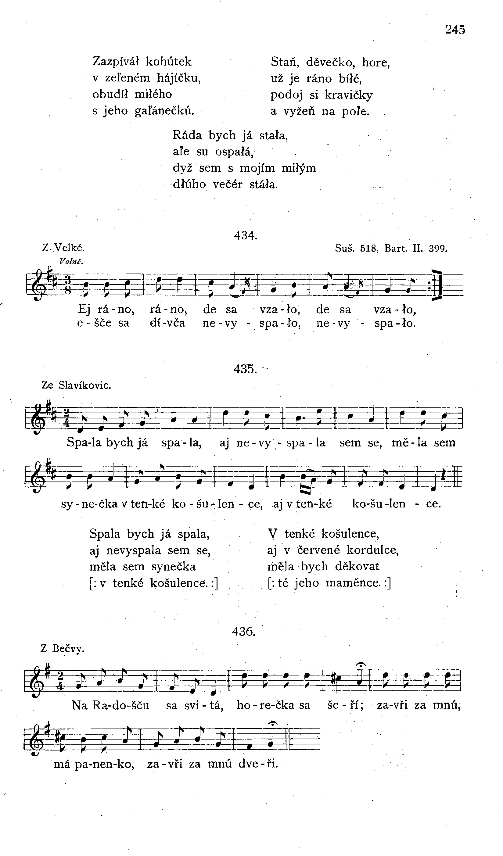 Aj vy páni muzikanti, zahrajte mně nahoru. Dyž sem já býł v mładých ľetech, odvédľi ně na vojnu; płakaľi o mně rodičé, má néjmiľéjší. Ach, kdo moje zarmúcené srce potěší? Žádný jiný, než má miłá a její čérné oči. Vy vězdičky, ste maľičký; dyž se na vás podívám, vašu krásu v spanilosti ve svém srdci rozjímám. Vy ste mně od Boha były v noci stvořeny, abyste mně svítívały do méj komory, až já půjdu, povandruju, od mojéj miłéj v noci. Tá dennička, tá nejvíce dycky mně svítívała, dyž sem já šéł od svěj miłéj, cestu ukazovała; za horama výstupováł bílý měsíček, od Dunaje zafúkováł ľibý větříček. Słunce krásné svítí jasně miłéj do okýneček.
