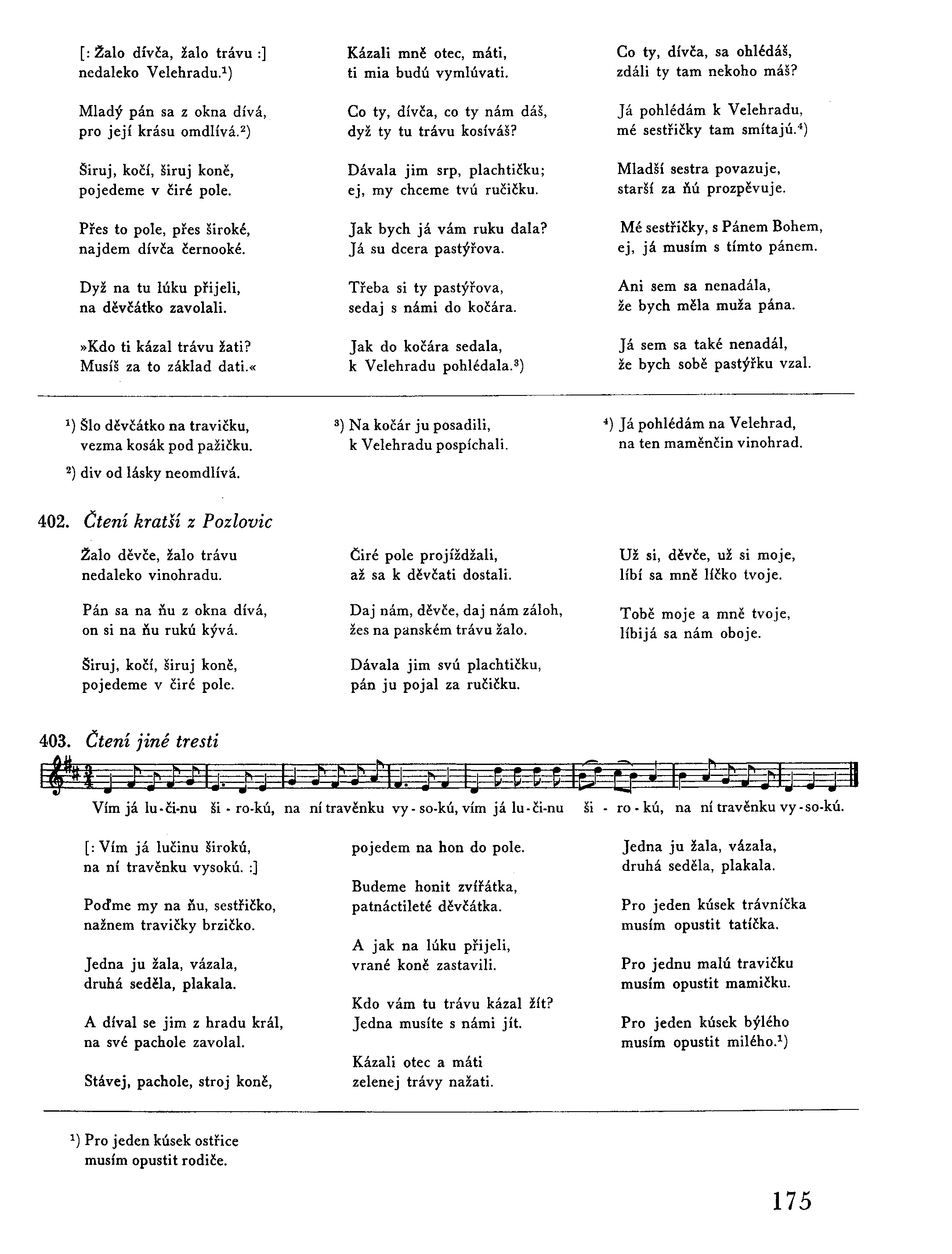 [: Žalo dívča, Žalo trávu :] nedaleko Velehradu. 1) Mladý pán sa z okna dívá, pro její krásu omdlívá. 2) Širuj, kočí, širuj koně, pojedeme v čiré pole. Přes to pole, přes široké, najdem dívča černooké. Dyž na tu lúku přijeli, na děvčátko zavolali. »Kdo ti kázal trávu žati? Musíš za to základ dati.« Kázali mně otec, máti, ti mia budú vymlúvati. Co ty, dívča, co ty nám dáš, dyž ty tu trávu kosíváš? Dávala jim srp, plachtičku; ej, my chceme tvú ručičku. Jak bych já vám ruku dala? Já su dcera pastýřova. Třeba si ty pastýřova, sedaj s námi do kočára. Jak do kočára sedala, k Velehradu pohlédala. 3) Co ty, dívča, sa ohlédáš, zdáli ty tam někoho máš? Já pohlédám k Velehradu, mé sestřičky tam smítajú. 4) Mladší sestra povazuje, starší za ňú prozpěvuje. Mé sestřičky, s Pánem Bohem, ej, já musím s tímto pánem. Ani sem sa nenadála, že bych měla muža pána. Já sem sa také nenadál, že bych sobě pastýřku vzal.