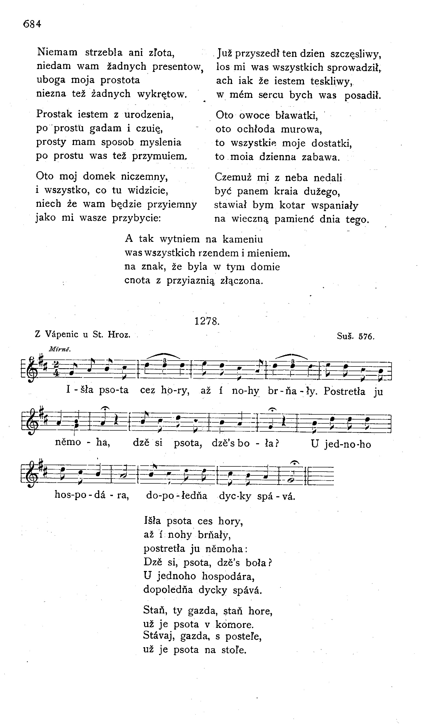 Ty si mysľíš, že nevyém, ked ty já nyšt nepovyém, vyém, čo študyruješ, dze keřů miłuješ, ver, že o tom dobré vyém. Tvoju tajnost dávno znám, po tebe ju poznávám, že myłéj tu nemáš, inú sebe hľadáš, hľadaj si ju, já nedbám. Hľadaj si ju, já nedbám, o to sa máło starám, pozbudem miłého, dostanem jiného, o to sa máło starám. Co hovoříš, čo mysľíš, fałešne ma v tom súdýš ver, že nemám myłú, teba ľen jedynú, Bůh je svedek nade mnú. Och idzi preč, nehovor, ľahko bys ma podvédoł, ľahko slovy tvýmy veľmy fałešnýmy do zúfalstvý privédoł. Zpomen, myłá, na sebe, čo som vystáł pre tebe, jak v zime, tak v ľéce, veľkém déždi, błace, chodzyévał sem vždy k tebe.