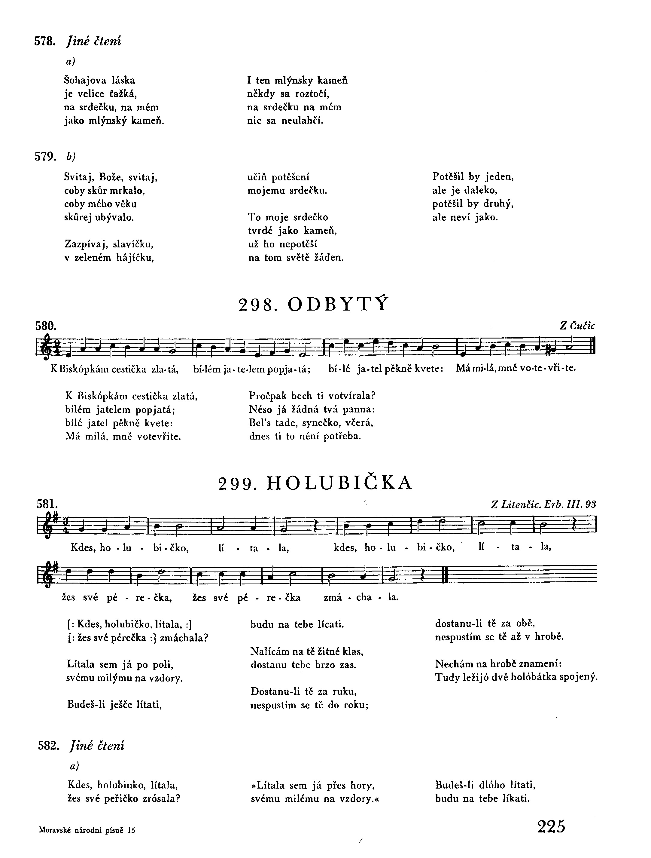 Kdes holubičko lítala, žes sobě líčko, krásné peříčko zrousala? „Lítala jsem já přes hory, svému milému, roztomilému na vzdory.“ Budeš-li ještě lítati, budu já na tě, má holubičko, líkati. Políknu na tě ječný klas: dostanu já tě, má holubičko, brzo zas. Políknu na tě žitíčko, dostanu já tě, má holubičko, brzičko. Políknu na tě do kvítí, dostanu já tě, má holubičko, do sítí. Políknu na tě na buku, dostanu já tě, má holnbičko, za ruku. Dostanu já tě, za ruku: nepustím já tě, má holubičko, do roku. Dostanu já tě za obě: nepustím já tě má holubičko, až v hrobě.