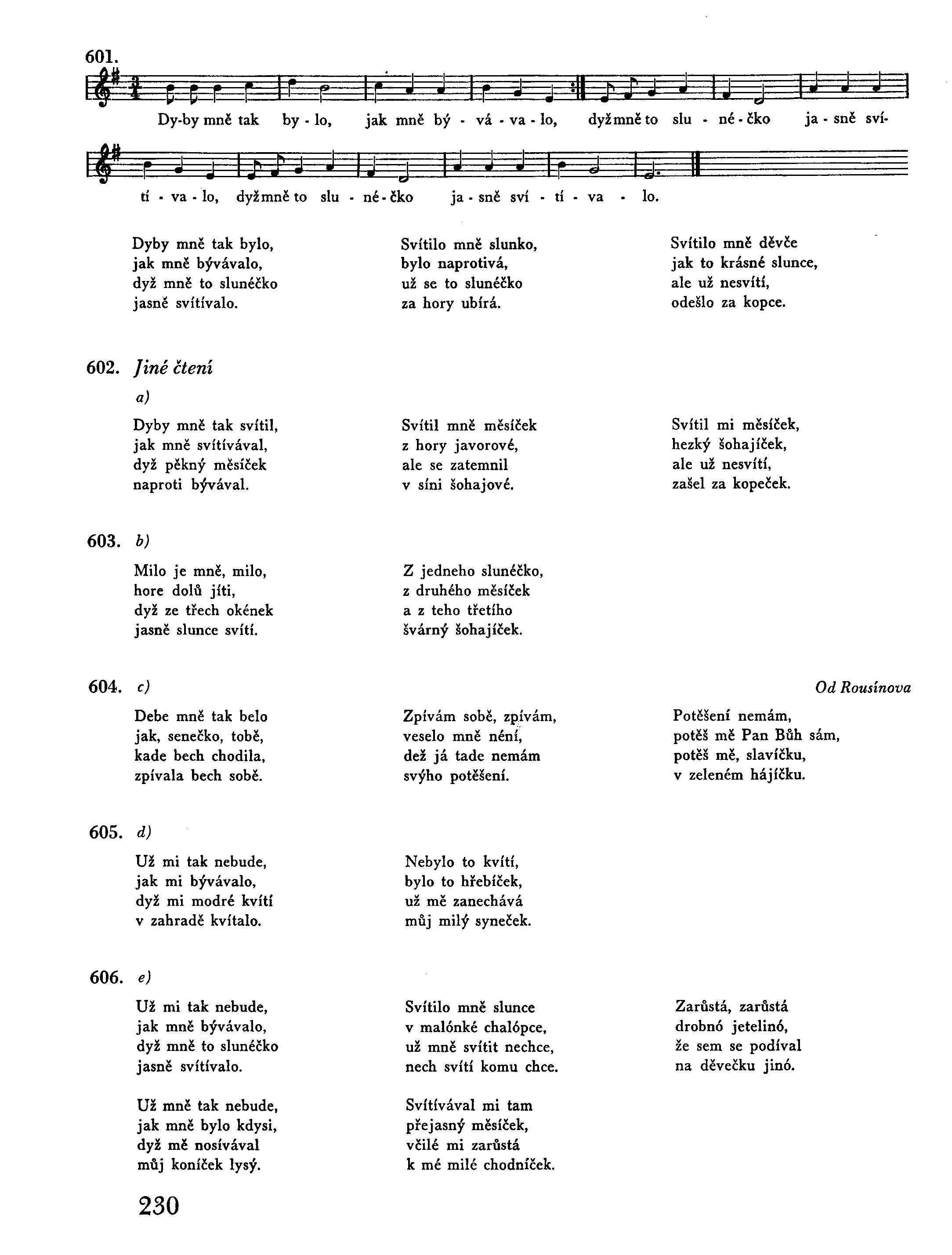 Dyby mně tak bylo, jak mně bývávalo, dyž mně to slunéčko jasně svítívalo. Svítilo mně slunko, bylo naprotivá, už se to slunéčko za hory ubírá. Svítilo mně děvče jak to krásné slunce, ale už nesvítí, odešlo za kopce.