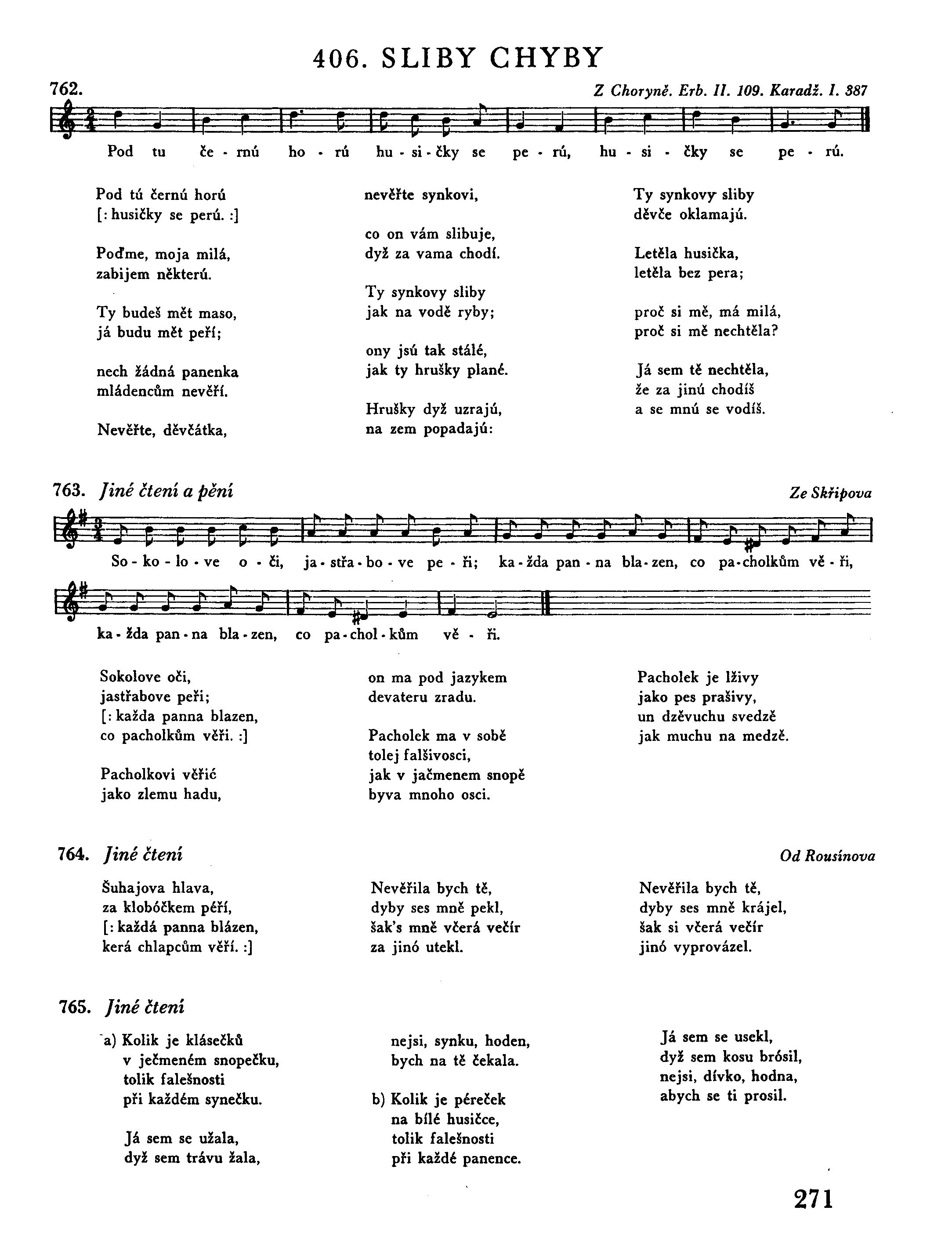 Synečku, synečku, velké sliby máme, [: kerý jich zrušíme, :] počet z něho dáme. Snadný já, děvečko, snadný já počet dám, dojda k farářovi hned sa vyzpovídám. Není, můj rozmilý, není farář Pán Bůh, on ti neodpustí, dyž mu povíš pravdu.1) Pěkně já ťa prosím, moja roztomilá, budu já putovat za tebe do Říma. Kdyby si putoval do Jeruzaléma, před hrubým oltářem padl na kolena; na kolena padl, sedům rázů omdlel, ješčě ti, synečku, odpuščat nebudem. Dopusť, Bože, dopusť takového hřmění, by na ťa padalo tři noci kamení. Bodaj ťa, synečku, popadla hodoňka, co by ťa držala do půl sedma roka. Do půl sedma roka, zrovna sedum roků, až by ti padali červi z tvého boku. Bodaj ťa, synečku, metalo vředisko, až by ťa hodilo na naše smetisko. Nekleň, milá, nekleň, už jsu proklnutý, snad mosím zahynút pod ludskýma ploty. Pod ludskýma ploty, jako ten hnilý klát, kerý sa nehodí ani do kamen dat.