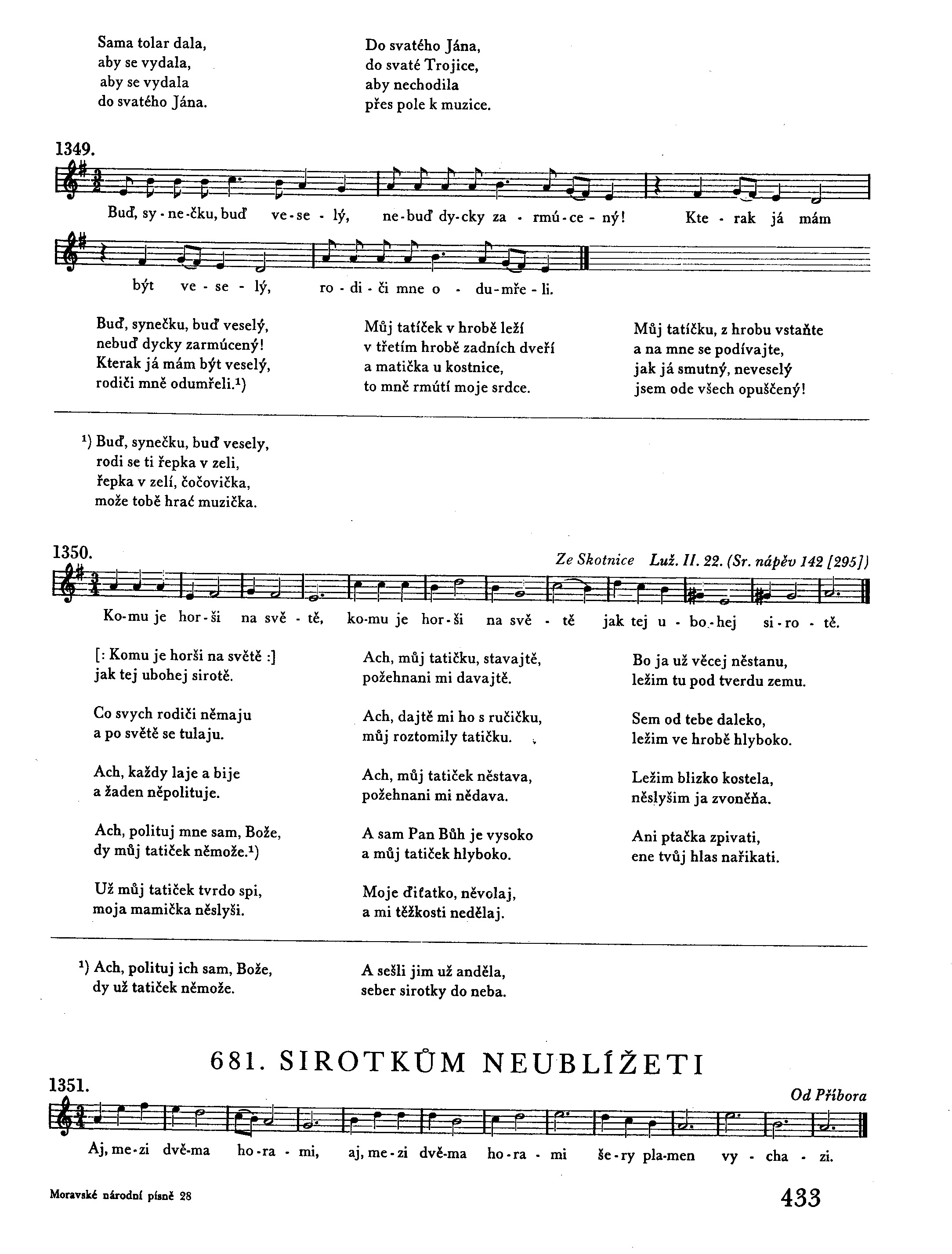 Buď, synečku, buď veselý, nebuď dycky zarmúcený! Kterak já mám být veselý, rodiči mně odumřeli.1) Můj tatíček v hrobě leží v třetím hrobě zadních dveří a matička u kostnice, to mně rmútí moje srdce. Můj tatíčku, z hrobu vstaňte a na mne se podívajte, jak já smutný, neveselý jsem ode všech opuščený!