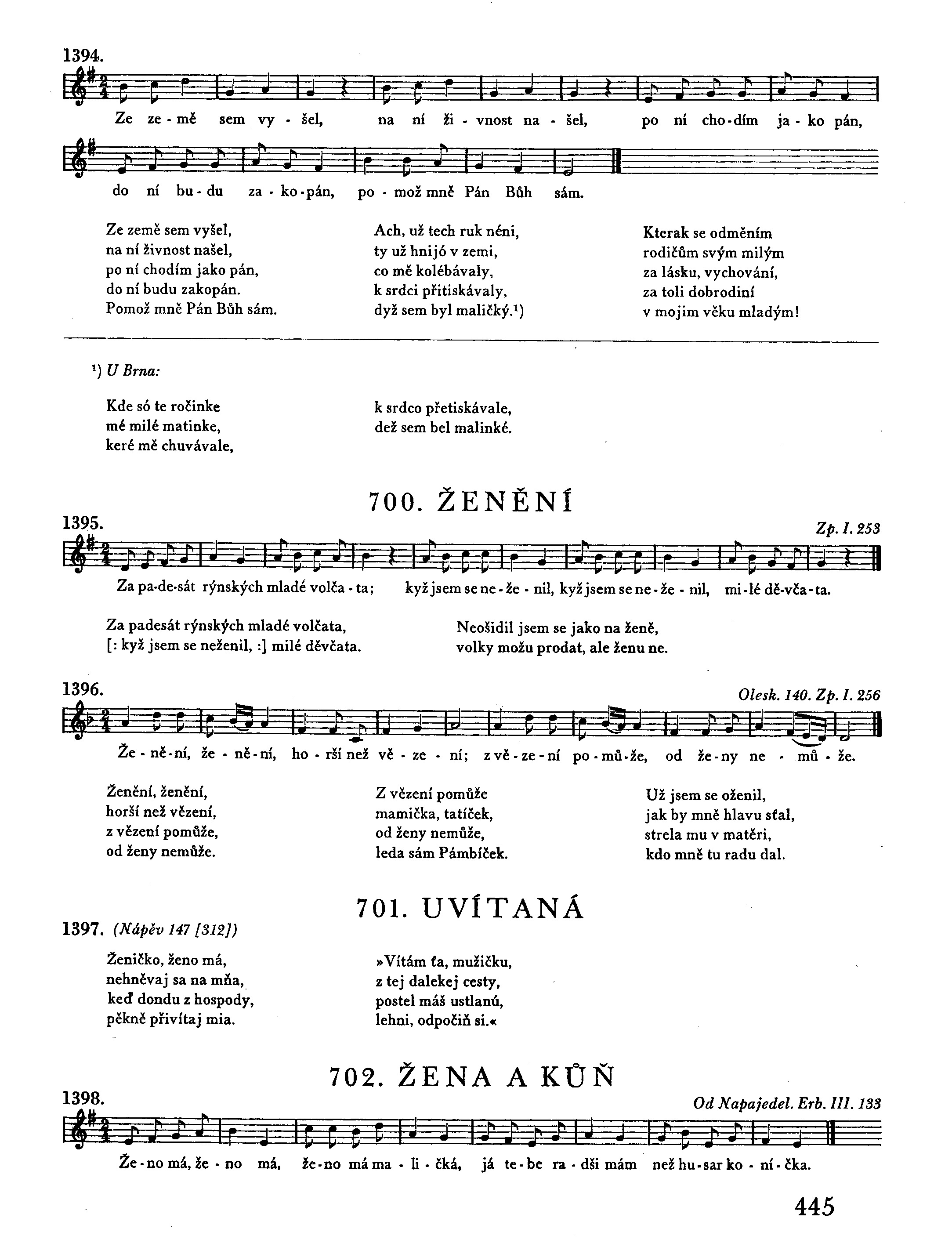 Zaspievaj, slávičku, [: v zelenom hájičku, :] a ja si zaspievam k milej po chodníčku. Dobre tebe, milá, [: na perinách ležať, :] ale mne je ťažko cez tie vŕšky bežať. Stúpaj, koník, stúpaj, [: stúpaj pomalíčky, :] žeby sme dnes došli k tej mojej Aničky. Veselo, koníček, [: veselo aj skokom, :] dones ma skoro k nej, dám ti obrok potom. Veselo, koníček, [: už sme na pol ceste, :] dones ma skoro k nej, prisypem ti ešte. Cesta, milá cesta, [: či ťa skoro prejdem, :] frajerečka moja, či ťa zdravú nájdem? Zdravú ju ty najdeš, [: neverí ťa dočkať, :] zažiadalo sa jej tvoje líčka bozkať.