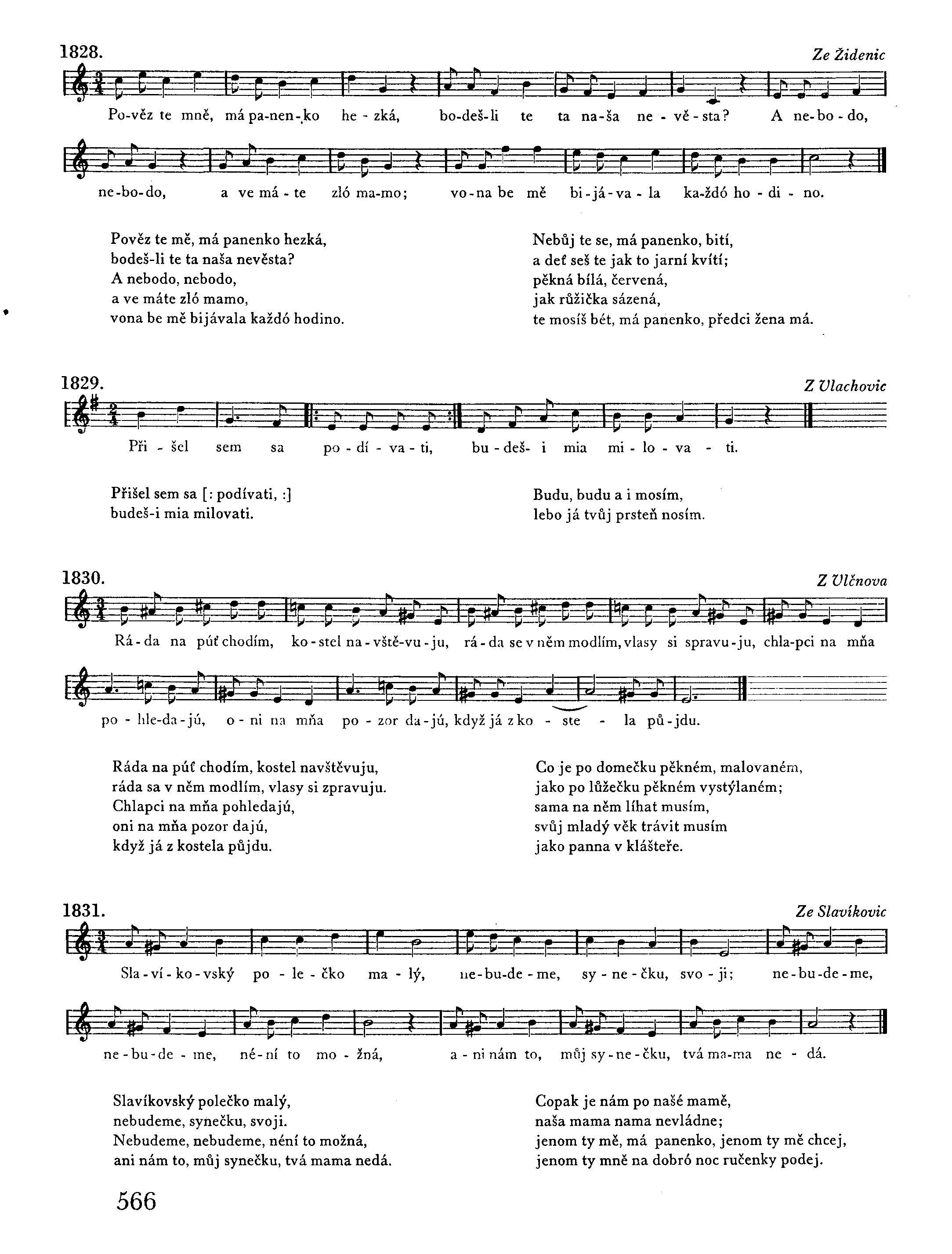 Pověz te mě, má panenko hezká, bodeš-li te ta naša nevěsta? A nebodo, nebodo, a ve máte zló mamo, vona be mě bijávala každó hodino. Nebůj te se, má panenko, bití, a deť seš te jak to jarní kvítí; pěkná bílá, červená, jak růžička sázená, te mosíš bét, má panenko, předci žena má.