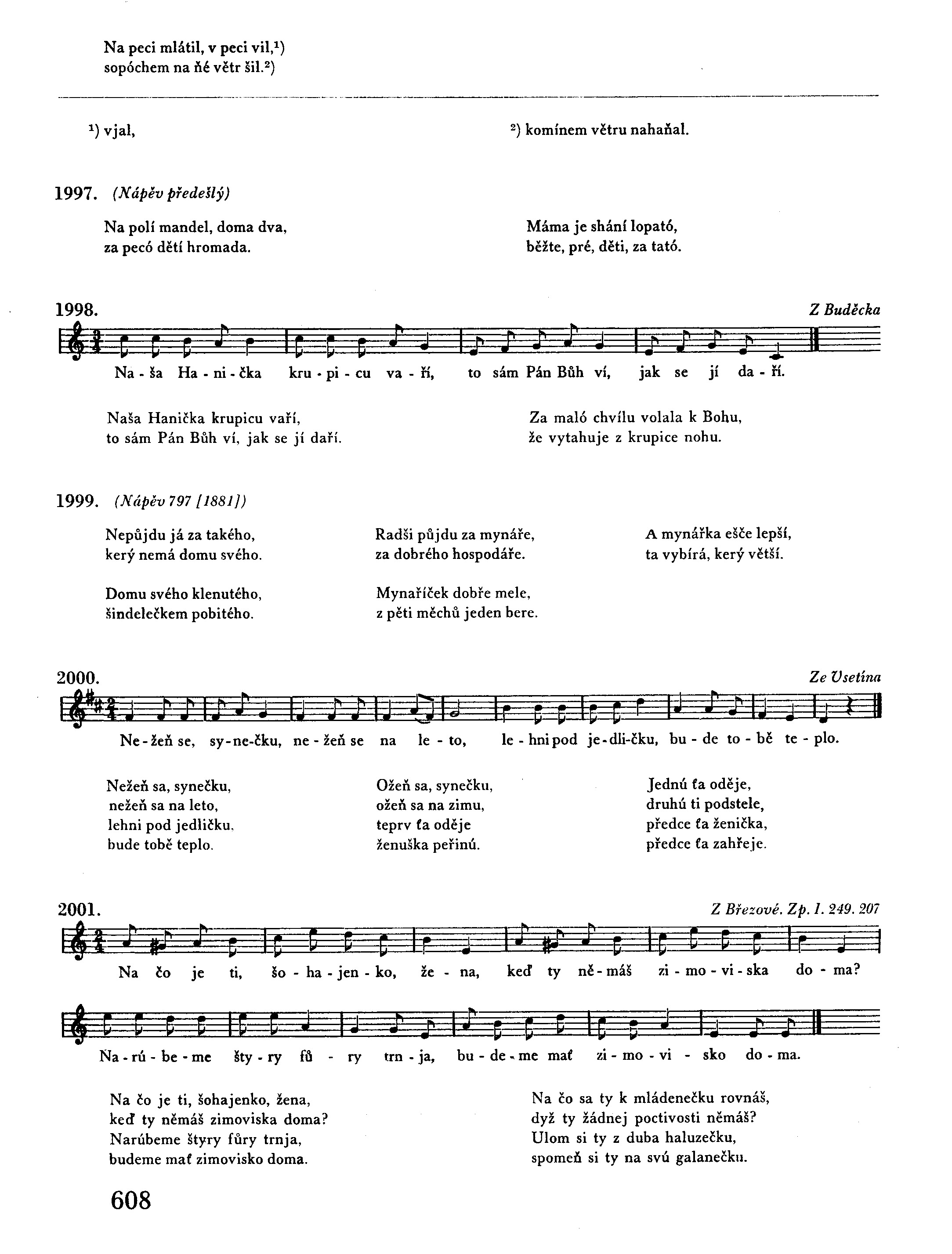 Kdo mně krmí koníčky, když jsem u svý holčičky? nechtěla mne domů pustit, že až zajdou hvězdičky. Hvězdičky se ztratily, já byl eště u milý: mý koníčky nekrmeny přenáramně řejhtaly. Mlčte, mlčte, koníčky! naseču vám travičky, abyste mi neřejhtaly, když jsem u svý holčičky. Žádnej neví jako já, jak je cesta v noci dlouhá; žádnej neví jako já, jak je cesta v noci zlá. Kdo mně krmí koníčky, když já nejsem v noci doma? kdo mně krmí koníčky, když jsem u svy holčičky? Kdo mně sklidí nádobí, když já v noci nejsem doma? kdo mně sklidí nádobí, když já jsem u svý milý? Vysoký jaloveček, vysoký jako já: kýž mi tě, má panenko, kýž mi tě pán Bůh dá! Proto jsem si kanafasku koupila, abych se ti, můj Jeníčku, líbila: na červenou, na zelenou, na bílou, abysi mně nechodíval za jinou. Šla má milá do háječka, do zeleného, potkala tam mládenečka modrookého. „Myslivečku mládenečku! přijďte rej tra k nám, já mám doma bílej šátek, a já vám ho dám.“ Mysliveček mládeneček dvéře otvírá, a ta jeho nejmilejší oči utírá. „Neplač, neplač, má panenko! vždyť se k tobě znám: až se žitko zazelená, ruku tobě dám.“ Před sousedy na potoce husy se perou: jdi, Jeníčku, vem flintičku, zabí některou. „Já ty husy nezabiju, já je dobře znám: jsou to husy paňmáminy, kam já chodívám. Kdybych já jí jednu zabil, hněvala by se; a kdybych tam potom přišel, vadila by se.“ Před sousedy na potoce husy se perou: Jdi, Jeníčku, vem flintičku,