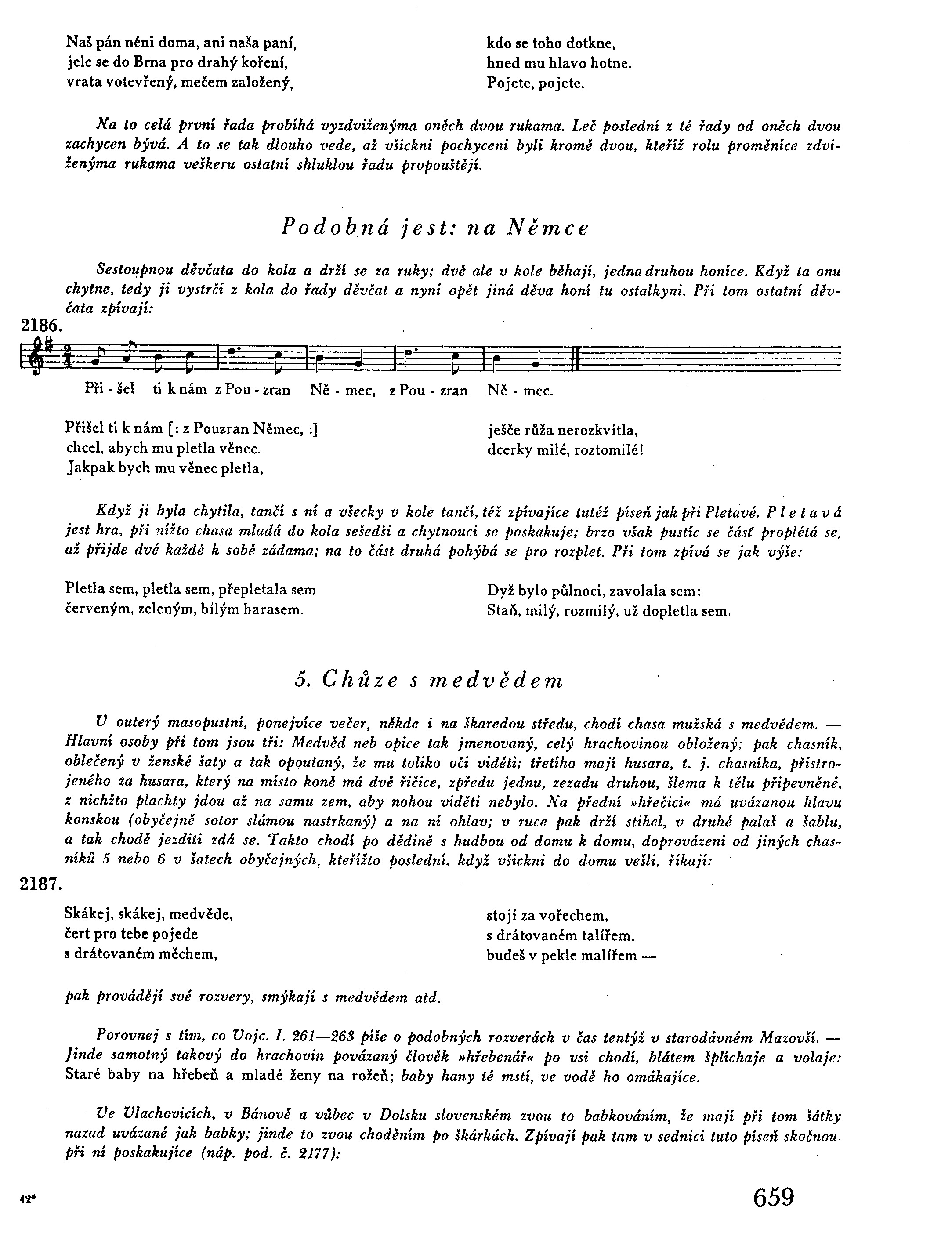 Přišel ti k nám [: z Pouzran Němec, :] chcel, abych mu pletla věnec. Jakpak bych mu věnec pletla, ješče růža nerozkvítla, dcerky milé, roztomilé! *) Pletla sem, pletla sem, přepletala sem červeným, zeleným, bílým harasem. Dyž bylo půlnoci, zavolala sem: Staň, milý, rozmilý, už dopletla sem.