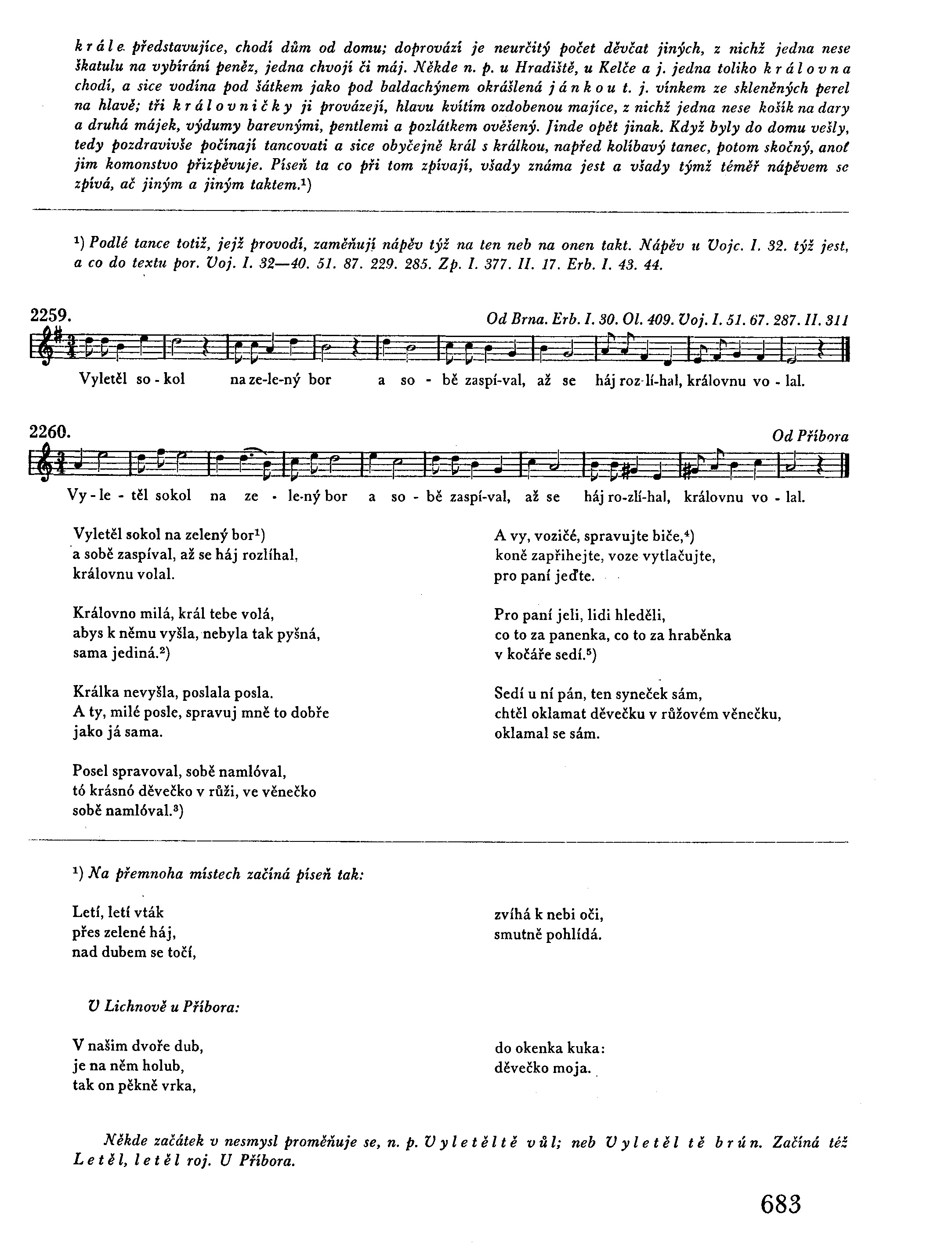 1) Na přemnoha místech začíná píseň tak: Letí, letí vták přes zelené háj, nad dubem se točí, zvíhá k nebi oči, smutně pohlídá. V Lichnově u Příbora: V našim dvoře dub, je na něm holub, tak on pěkně vrká, do okenka kuka: děvečko moja. Někde začátek v nesmysl proměňuje se, n. p. Vyletěltě vůl; neb Vyletěl tě brún. Začíná též Letěl, letěl roj. U Příbora. Přeletěl havrun přes ten pansky dvůr, sednul v okeneěku na zlatem stolečku, rozložil (č. roztočil) ogun. 2) Že ti neco dá, šáteček bílý, červený, modrý vyšívaný. 3) Posel spravoval, sobě namlóval, zeleného vínka, zlatého prsténka na stole nechal. 4) A vy, šnorařé, šnorujte biče, koně vyvaďajte, koče vytlačujte a pro ňu jeďte. Anebo na Hané: A vy, pohůnci, hrubě malincí, bičíky šmarujte, pro královnu jeďte. Sem ju dovezte. Anebo: A vy, pacholci, malí i velcí, drobnó sečku řežte, koně dobře češte, s královno jeďte. Podobně i tato slova v ústech některých děv v nedomysl přechodí n. p. Vy milí viči; anebo jinde a vy kočíše. Kočíš slovo sice dostupné (t. j. kočí) leč co znamená viči či Viči? 5) pěkně si hledí. anebo: hudci jí hrajó. V Lichnově u Příbora píseň ta zpívá se při odvážení nevěsty. Vyletěl sokol, sednul na topol, sednul na sluněnko, na pěkne okenko, vesele spival.1) Děvečko moja, synek tě vola, abys k němu vyšla, nebyla tak pyšná sama jediná. Ona nevyšla, poslala posla: Ach, můj milý posle, spravuj mi to dobře jako ja sama. Posel spravoval, sobě namluval, ale se s tim stranil a dcerušku hanil, že je lenivá. Ona zaslechla, ven vyskočila, v zelenem vinečku, v zlatem prstenečku se vytočila. Pacholičku můj, koničky širuj, koničky vyvaďaj, do voza zapřahaj, pojeděmy preč.2) A dy s ňu jeli, ludě hleděli, co to za panenka, co to za hraběnka ve voze sedi. Přijeli v pole, stanuli v kole: Pověz mi, děvečko, je-li tvoje všecko co je ve voze? Všecko je moje, co je ve voze, a sem zapomněla vinka zeleneho doma na stole. Pacholiček šel, vinka nenašel; jak to uslyšela, zaplakať musela o věneček svůj. 1) Přiletěl havrun na susedův dům, sednul v okenečku v zelenem věnečku, tam se rozvinul. 2) Posel spravoval, sobě namluval, prošvarnu děvečku v růžovym věnečku sobě namluval. Vyjeli v pole, stanuli v dole, zapomněli věnka, zlateho prstenka doma na stole, Kochanečku můj, vrať že se mi proň, bo jak se něvratiš, to mi ho zaplatiš a něbudeš můj. Když vyzpívána jest píseň ta, změňuje se tanec, ač jinde jinak, a píseň jiná se zpívá při něm již dvojitým, již trojitým chodem.
