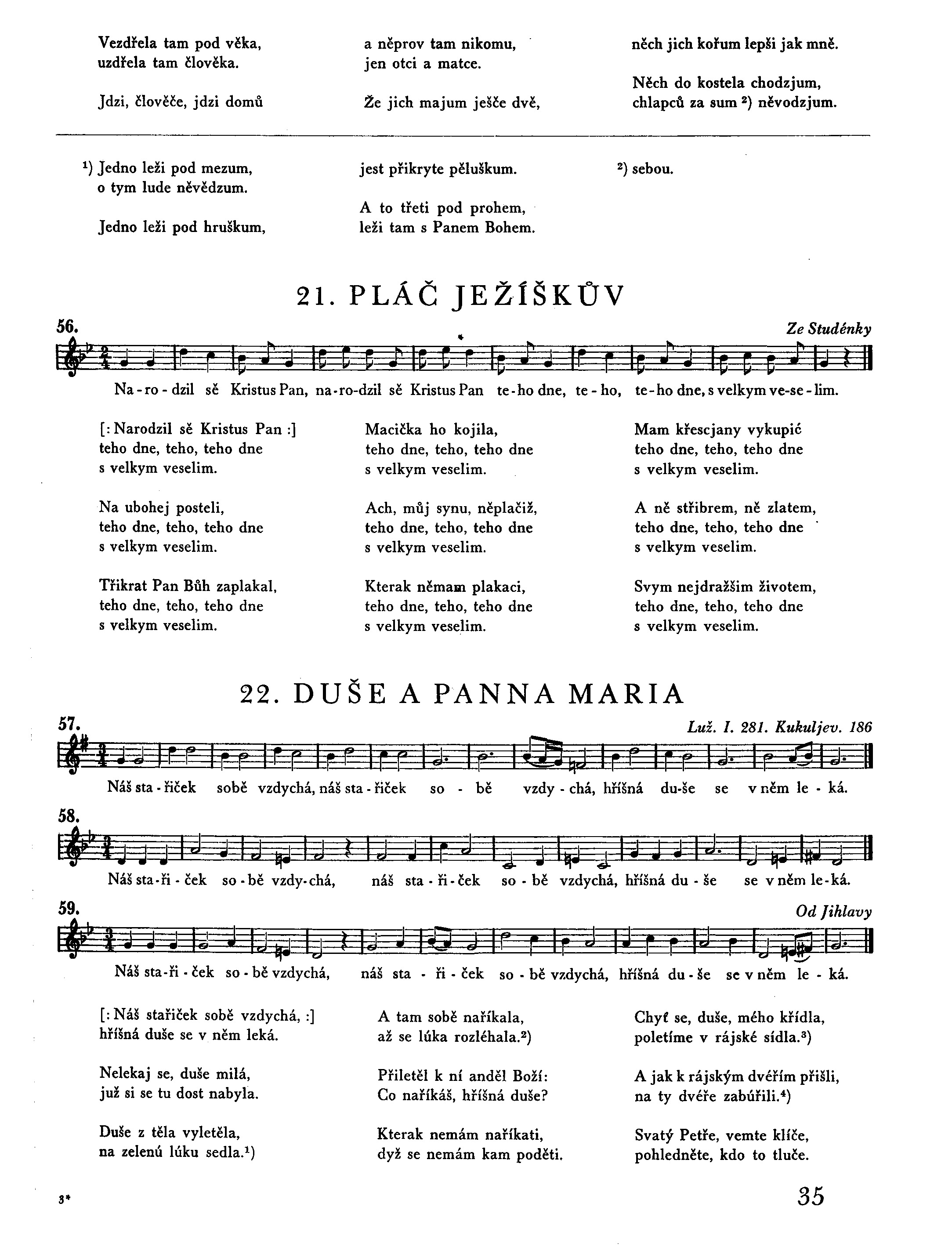 [: Náš stařiček sobě vzdychá, :] hříšná duše se v něm leká. Nelekaj se, duše milá, juž si se tu dost nabyla. Duše z těla vyletěla, na zelenú lúku sedla.1) A tam sobě naříkala, až se lúka rozléhala.2) Přiletěl k ní anděl Boží: Co naříkáš, hříšná duše? Kterak nemám naříkati, dyž se nemám kam poděti. Chyť se, duše, mého křídla, poletíme v rájské sídla.3) A jak k rájským dvéřím přišli, na ty dvéře zabúřili.4) Svatý Petře, vemte klíče, pohledněte, kdo to tluče. Tluče to tam anděl Boží, za ním hříšná duše stojí. Mého anděla sem pusťte, hříšné duši pryč ukažte. Ukažte jí cestu šírú, kady hříšní do pekla jdú. Šla dušička plakající a svých hříchů litující. Potkala ju matka Boží: Co naříkáš, hříšná duše? A jak nemám naříkati, dy se nevím kam poděti! Vrať se, duše, vrať se se mnú, přimluvím se k mému synu.5) Jak k nebeským vratům přišly, na ty vrata zabúřily. Svatý Petře, vemte klíče, pohlednite, kdo to tluče. Tluče to, pane, matka tvá, za ňú stojí duše hříšná. Mú matičku mně sem pusťte, duši hříšné odtad kažte. Kažte jí cestu širokú, kady hříšní do pekla jdú. Ne tak, ne tak, synu milý, odpusť hříšné duši viny. Já jí viny neodpustím, za hříchy ju trestat musím, nedávala ona chudým. Do kostela nechodila, na ofěry nedávala. Pátečky se nepostila a svátečky nesvětila. Podej, duše, svého prsta, povedu tě do očistca. Duše prsta podávala, po pás v smole zostávala. Podej, duše, pravé ruky, povedu tě skrze muky. Skrze muky do propasti, potom do nebeské slasti.6) Duse ruky podávala, celá ve smole zůstala. Podej, duše, pravé ruky, vyvedu tě z těžké muky. Duše ruky podávala, k živému Bohu volala. Chyť se, duše, mého prstu, přivedu tě k Pánu Kristu.7) Jak k nebeským vratům přišly, na ty vrata zabúřily. Svatý Petře, vemte klíče, pohledněte, kdo to tluče. Tluče to, pane, matka tvá, a za ňú zas hříšnice ta. Mú matičku mně sem pusťte, hříšné duši odtad kažte. Kažte jí cestu širokú, kady hříšní do pekla jdú. Ne tak, ne tak, synu milý, odpusť hříšné duši viny. Já jí viny neodpustím, za hříchy ju trestat musím. Už ona dost podstúpila, v očistcových mukách byla. Poď, dušičko vyvolená, drahú krví vykupená. Poď, dušičko, večeřati, budeš s námi přebývati. Pane Bože, budiž chvála, do nebe sem se dostala.