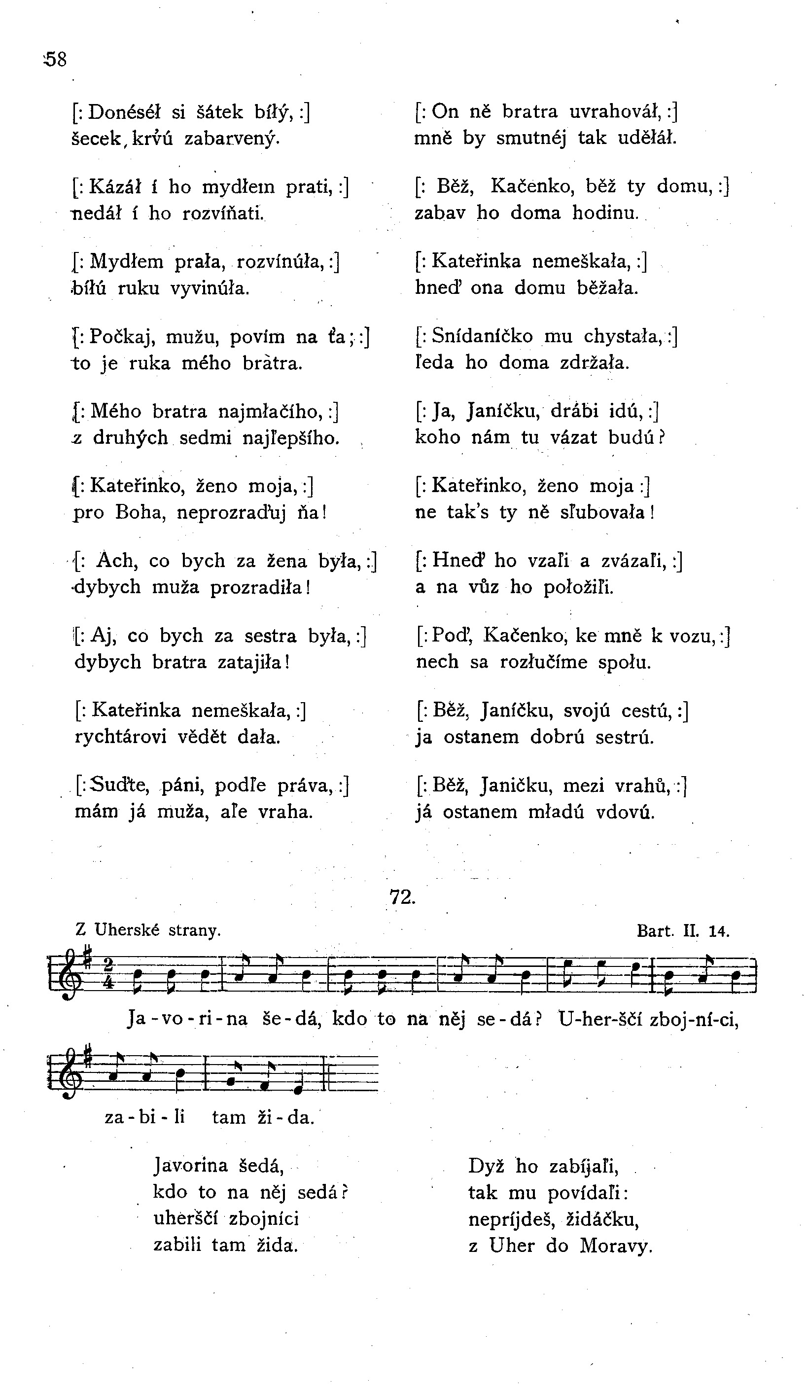[: Jede Janóšek přes hory, :] veze Marušku na koni. Kázal Marušce spívati a horám sa rozléhati. Spívaj, Maruško, pěsničku, veselú, pěknú maličkú. Jak si ju doma spívala, dy’s u otca, matky byla. Jala Maruška spívati a hory sa rozlíhati. Učuli tě ju zbojníci, velehradščí lúpežníci. Poďme, my mu ju vezmeme, toho zrádca zabijeme. Ustup, Maruško, na levo, pod javor, zelené dřevo. Janóšek mečem zatočil, po dvanásti hlavách skočil. Třinástý sa mu vyprosil, že by za ním zbrojí nosil. Nezabíjaj mne, Janíčku, složím o tobě pěsničku. »Vím já bránu malovanú, zlatem, stříbrem okovanú.« Kdo tu bránu malovat dal, zlata, stříbra nelitoval. Ten tu bránu malovat dal, kdo Marušku domiloval.