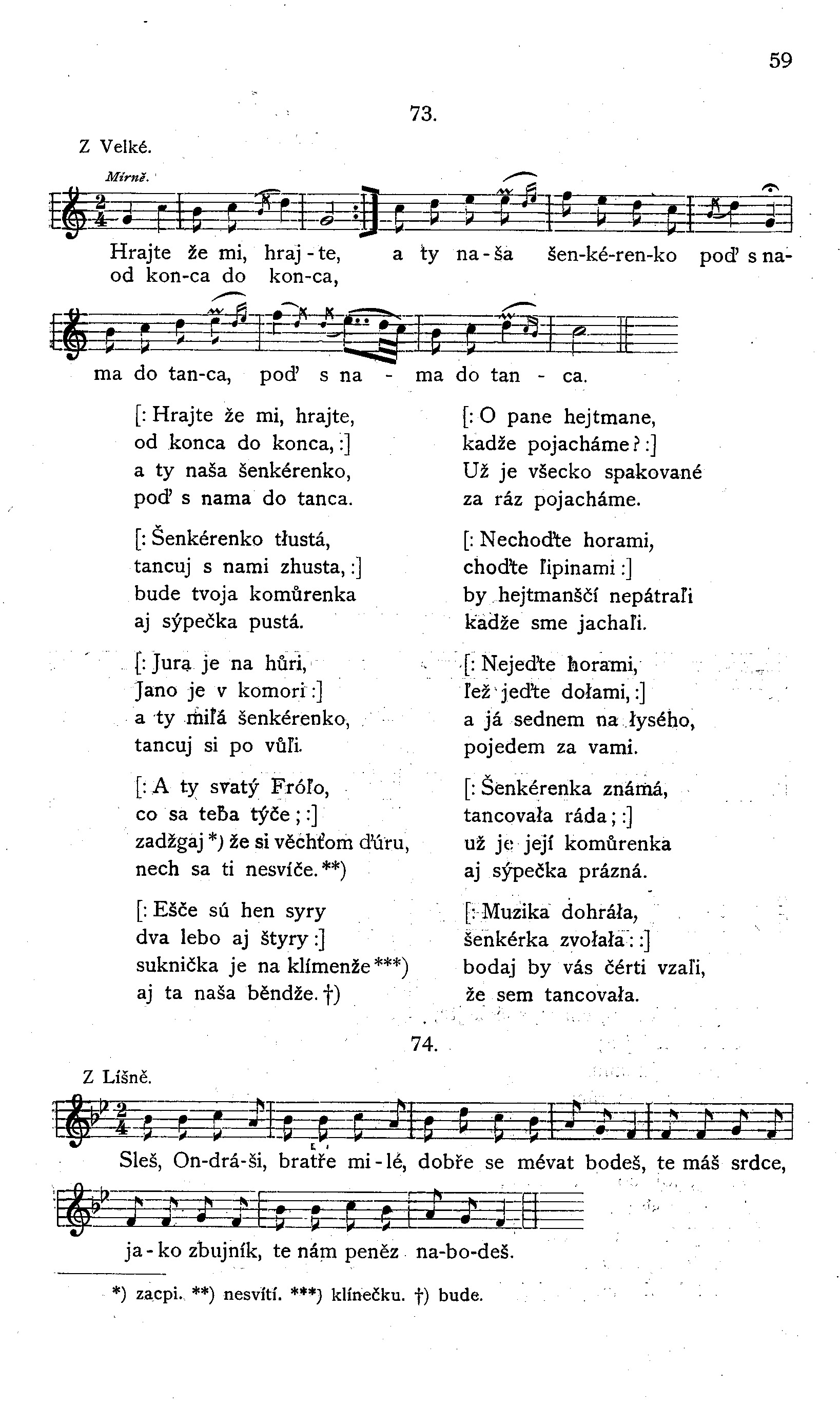 [: Hrajte že mi, hrajte, od konca do konca, :] a ty naša šenkérenko, poď s nama do tanca. [: Šenkérenko tłustá, tancuj s námi zhusta, :] bude tvoja komůrenka aj sýpečka pustá. [: Jura je na hůri, Jano je v komori :] a ty miľá šenkérenko, tancuj si po vůli. [: A ty svátý Fróľo, co sa teba týče ; :] zadžgaj *) že si věchťom ďúru, nech sa ti nesvíče.**) [: Ešče sú hen syry dva lebo aj štyry :] suknička je na klímenže ***) aj ta naša běndže. †) [: O pane hejtmane, kadže pojacháme? :] Už je všecko spakované za ráz pojacháme. [: Nechoďte horami, choďte ľipinami :] by hejtmanščí nepátraľi kadže sme jachaľi. [: Nejeďte horami, ľež jeďte dolami, :] a já sednem na łysého, pojedem za vámi. [: Šenkérenka známá, tancovala ráda ;:] už je její komůrenka aj sýpečka prázdná. [: Muzika dohráła, šenkérka zvołała ::] bodaj by vás čérti vzaľi že sem tancovala.