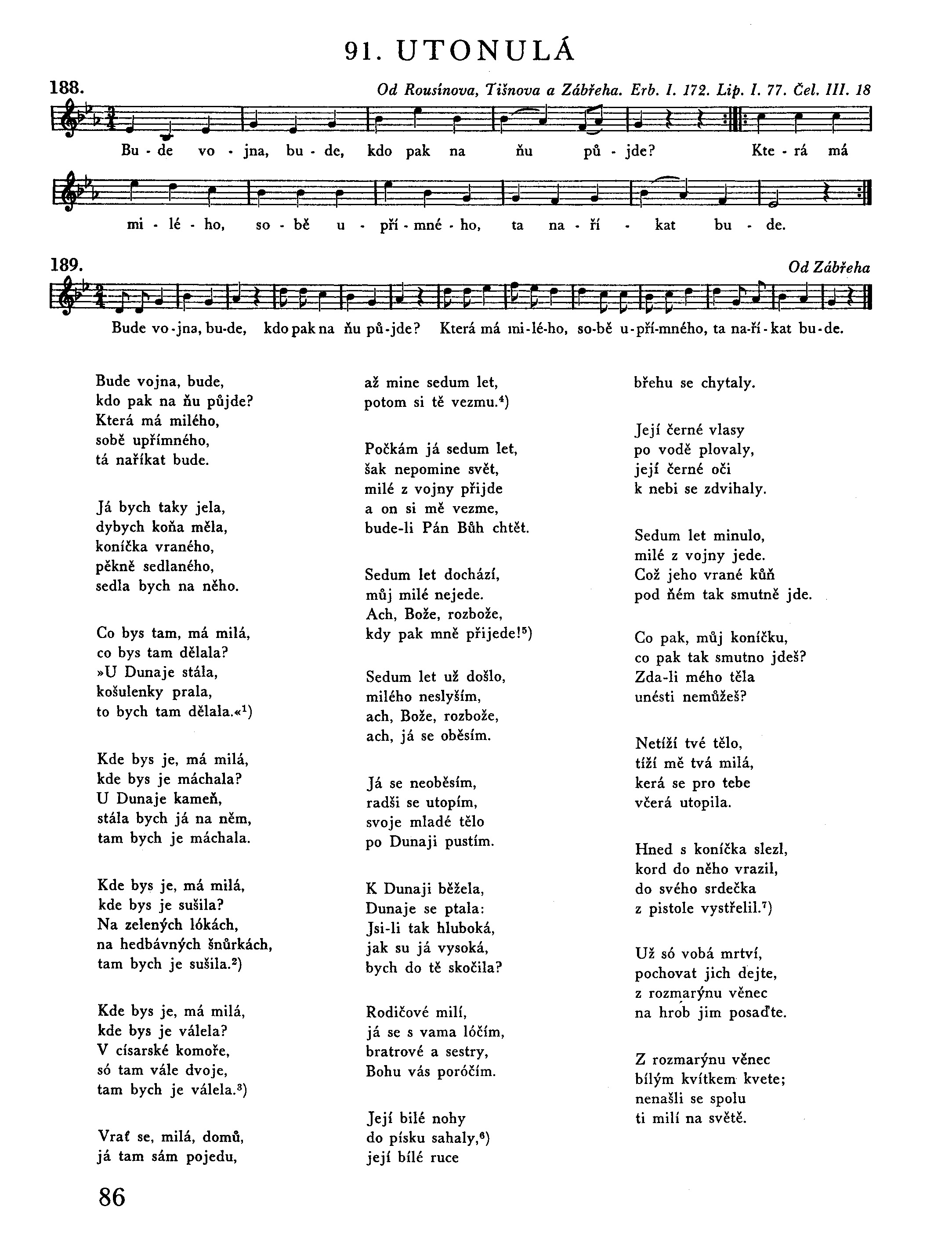 Bude vojna, bude, kdo tam na ni pojde? která má milého k sobě upřímného, ta naříkat bude. „A já mám milého k sobě upřímného: kdyby mně císař pán koníčka daroval, sedla bych na něho.“ „Co bys tam, má milá, co bys tam dělala?“ – „Prala bych košile, abys chodil bíle, to bych tam dělala.“ „Kde bys je, má milá, kde bys je máchala?“ – „V Dunaji je kámen, tam bych stála na něm, tam bych je máchala.“ „Kde bys je, má milá, kde bys je sušila?“ – „Na královském dvoře, na hedbávné šňůře, tam bych je sušila.“ „Kde bys je, má milá, kde bys je skládala?“ – „Na vraném koníčku, můj zlatý holečku, tam bych je skládala.“ „Vrať se, milá, domfi, poruč pánu Bohu: až sedum let mine, ta vojna pomine, potom si tě vemu.“ „Sedum let dochází, milý nepřichází: ach Bože, Bože můj! on mi tam zahynul, má radost přechází.“ U Dunaje stála, Dunaje se ptala: „Jsi-li tak hluboký, jako jsi široký?“ Dunaje se ptala. Do vody skočila, hned se potopila: „Ach Bože, Bože můj! nade mnou se smiluj, co jsem učinila!“ Její bílé nohy po písku šlapají; její bílé ruce, její bílé ruce břehu se chytají. Její černé vlasy Po vodě plávají; její modré oči, její modré oči k nebi se zdvihají. Sedum let minulo, milý z vojny jede: což jeho vraný kůň, což jeho vraný kůň pod ním tak těžce jde? „Což pak, můj koníčku, což mi tak těžce jdeš? zdali mne mladého jinocha švárného unesti nemůžeš?“ „Netíží tvé tělo, tíží mě tvá milá: která se pro tebe, která se pro tebe včera utopila.“ Milý se otočil, s koně dolů skočil, a svůj ostrý palaš, a svůj ostrý palaš v srdci si omočil. Nenašli se spolu na tom marném světě: nynčko jim na hrobě, nynčko jim na hrobě rozmarína květe.