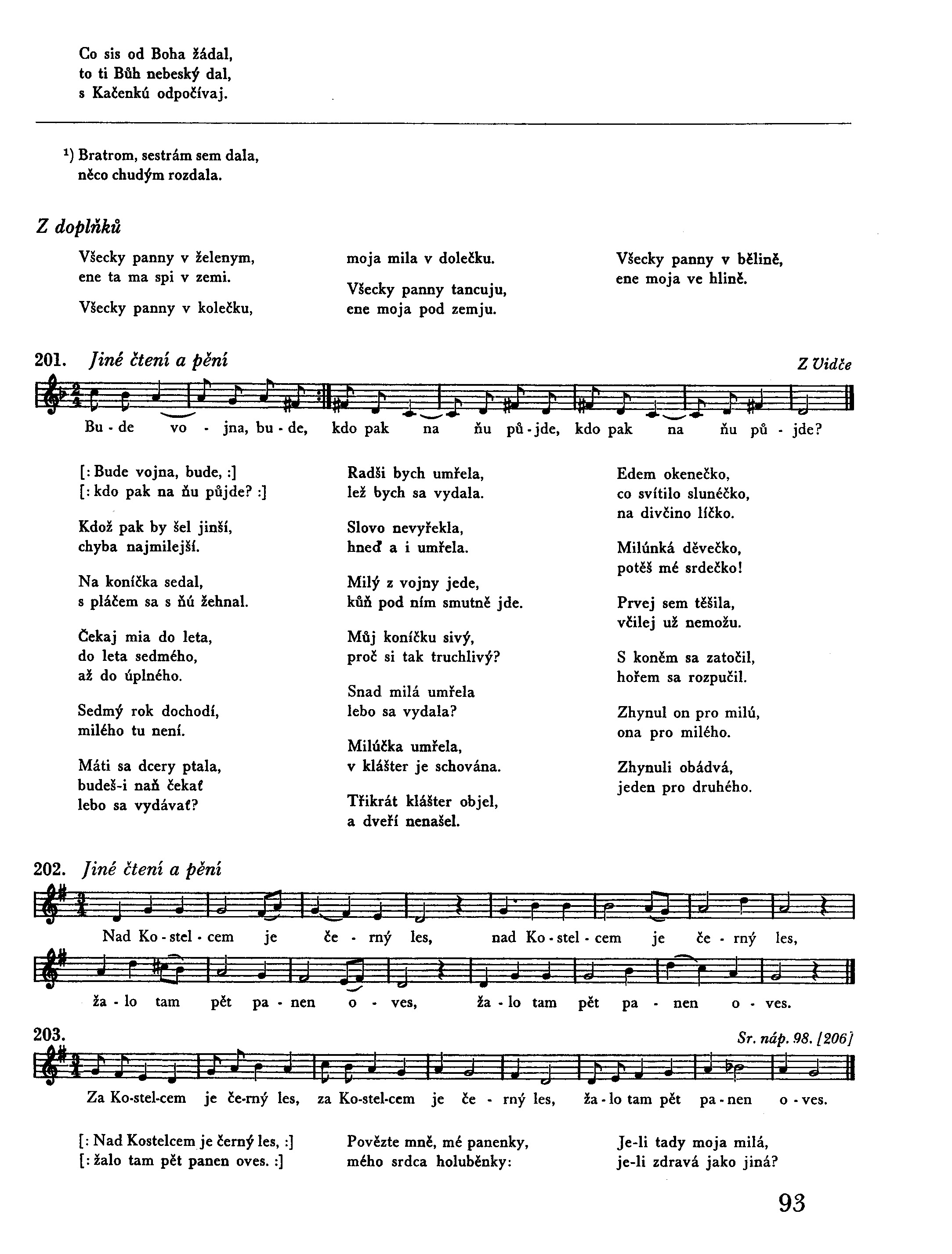 [: Bude vojna, bude, :] [: kdo pak na ňu půjde? :] Kdož pak by šel jinší, chyba najmilejší. Na koníčka sedal, s pláčem sa s ňú žehnal. Čekaj mia do leta, do leta sedmého, až do úplného. Sedmý rok dochodí, milého tu není. Máti sa dcery ptala, budeš-i naň čekať lebo sa vydávať? Radši bych umřela, lež bych sa vydala. Slovo nevyřekla, hneď a i umřela. Milý z vojny jede, kůň pod ním smutně jde. Můj koníčku sivý, proč si tak truchlivý? Snad milá umřela lebo sa vydala? Milúčka umřela, v klášter je schována. Třikrát klášter objel, a dveří nenašel. Edem okenečko, co svítilo slunéčko, na divčino líčko. Milúnká děvečko, potěš mé srdečko! Prvej sem těšila, včilej už nemožu. S koněm sa zatočil, hořem sa rozpučil. Zhynul on pro milú, ona pro milého. Zhynuli obádvá, jeden pro druhého.