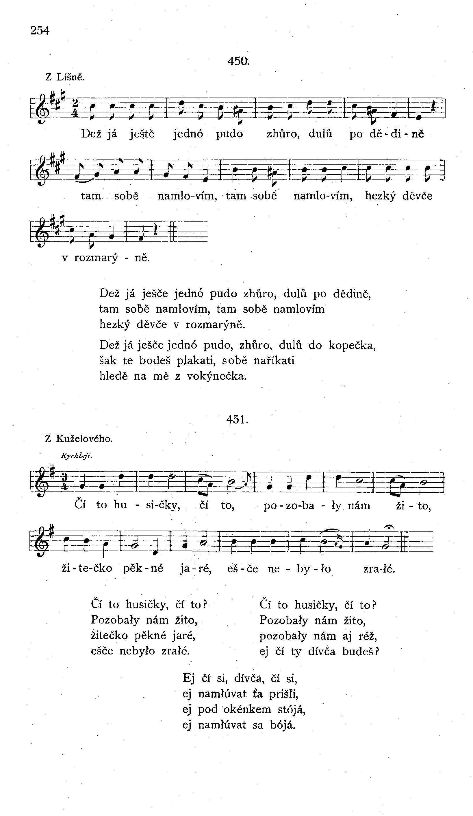 Nic to, má milá, nic to, všecko to z lidí přišlo; z lidského návodu, poručeno Bohu. Já sem syneček, já sem, já sem chodíval špásem, myslelas opravdu, že si tebe vezmu? Čí to husičky, čí to? Pozobaly nám žito, pozobaly nám jaré, ešče nebylo zralé.