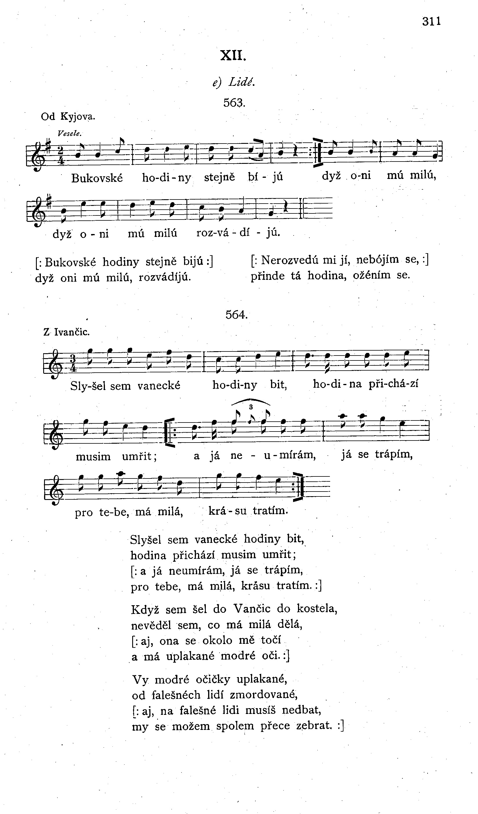 Slyšel sem vanecké hodiny bit, hodina přichází musim umřit; [: a já neumírám, já se trápím, pro tebe, má milá, krásu tratím. :] Když sem šel do Vančic do kostela, nevěděl sem, co má milá dělá, [: aj, ona se okolo mě točí a má uplakaté modré oči. :] Vy modré očičky uplakané, od falešných lidí zmordované, [: aj, na falešné lidi musíš nedbat, my se možem spolem přece zebrat. :]