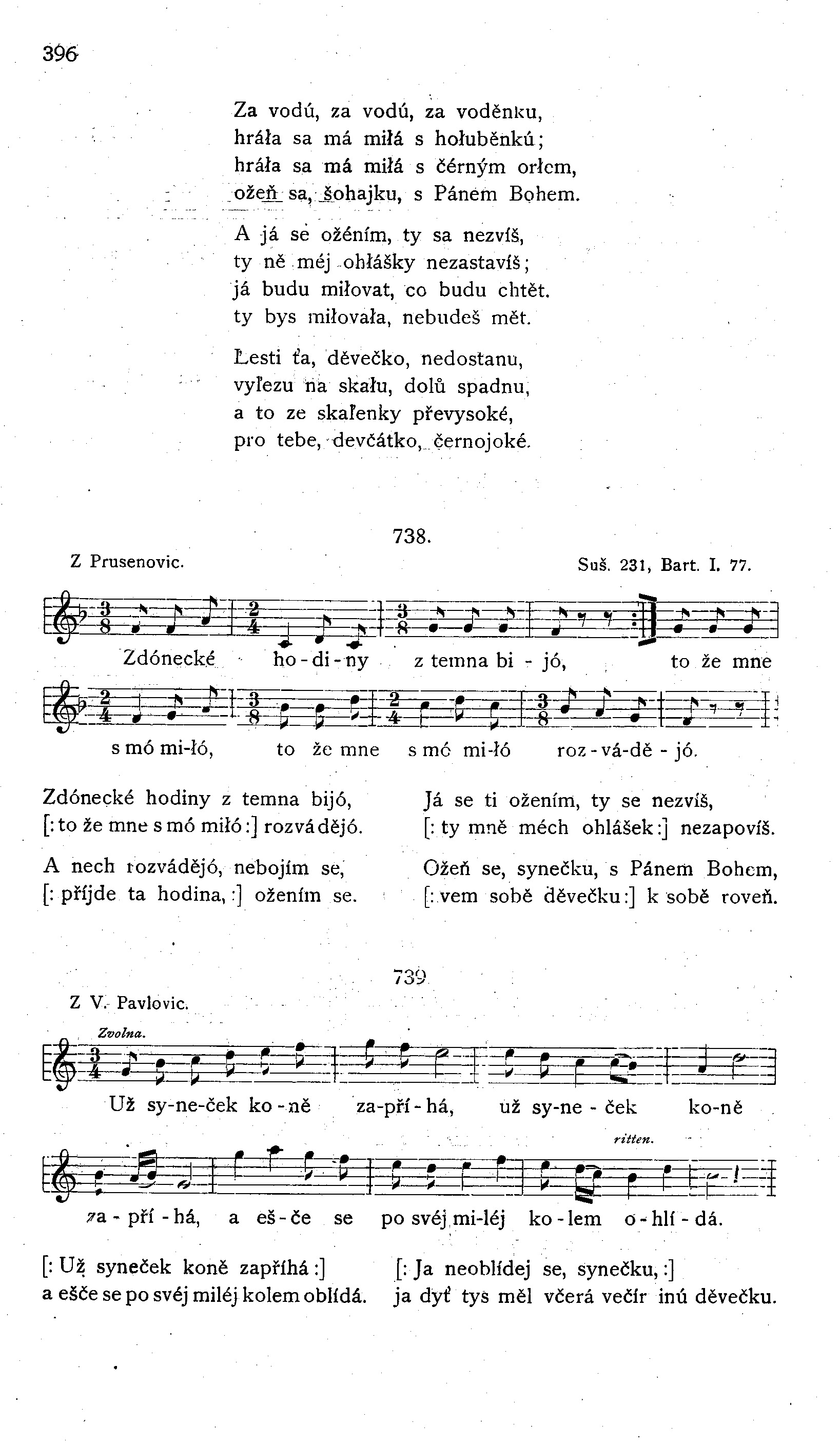 Zdónecké hodiny z temna bijó, [: to že mne s mó miłó :] rozvádějó. A nech rozvádějó, nebojím se, [: příjde ta hodina, :] ožením se. Já se ti ožením, ty se nezvíš, [: ty mně méch ohlášek :] nezapovíš. Ožeň se, synečku, s Pánem Bohem, [: vem sobě děvečku :] k sobě roveň.