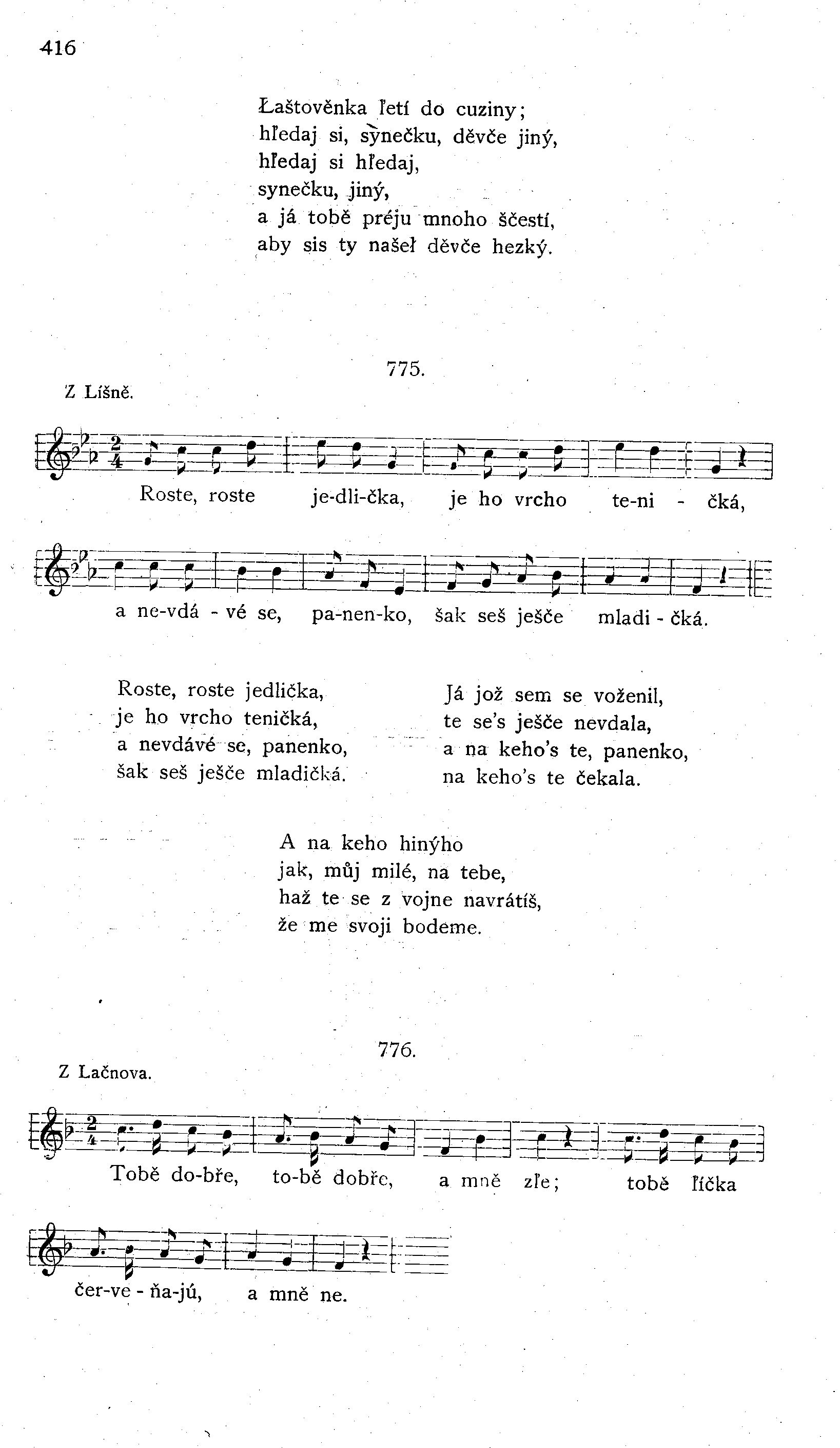 Za vodú, za vodú, za voděnku, hráła sa má miłá s hołuběnkú; hráła sa má miłá s čérným orłem, ožeň sa, šohajku, s Pánem Bohem. A já se ožéním, ty sa nezvíš, ty ně méj ohłášky nezastavíš; já budu miłovat, co budu chtět. ty bys miłovała, nebudeš mět. Ľesti ťa, děvečko, nedostanu, vyľezu na skału, dolů spadnu, a to ze skaľenky převysoké, pro tebe, devčátko, černojoké.