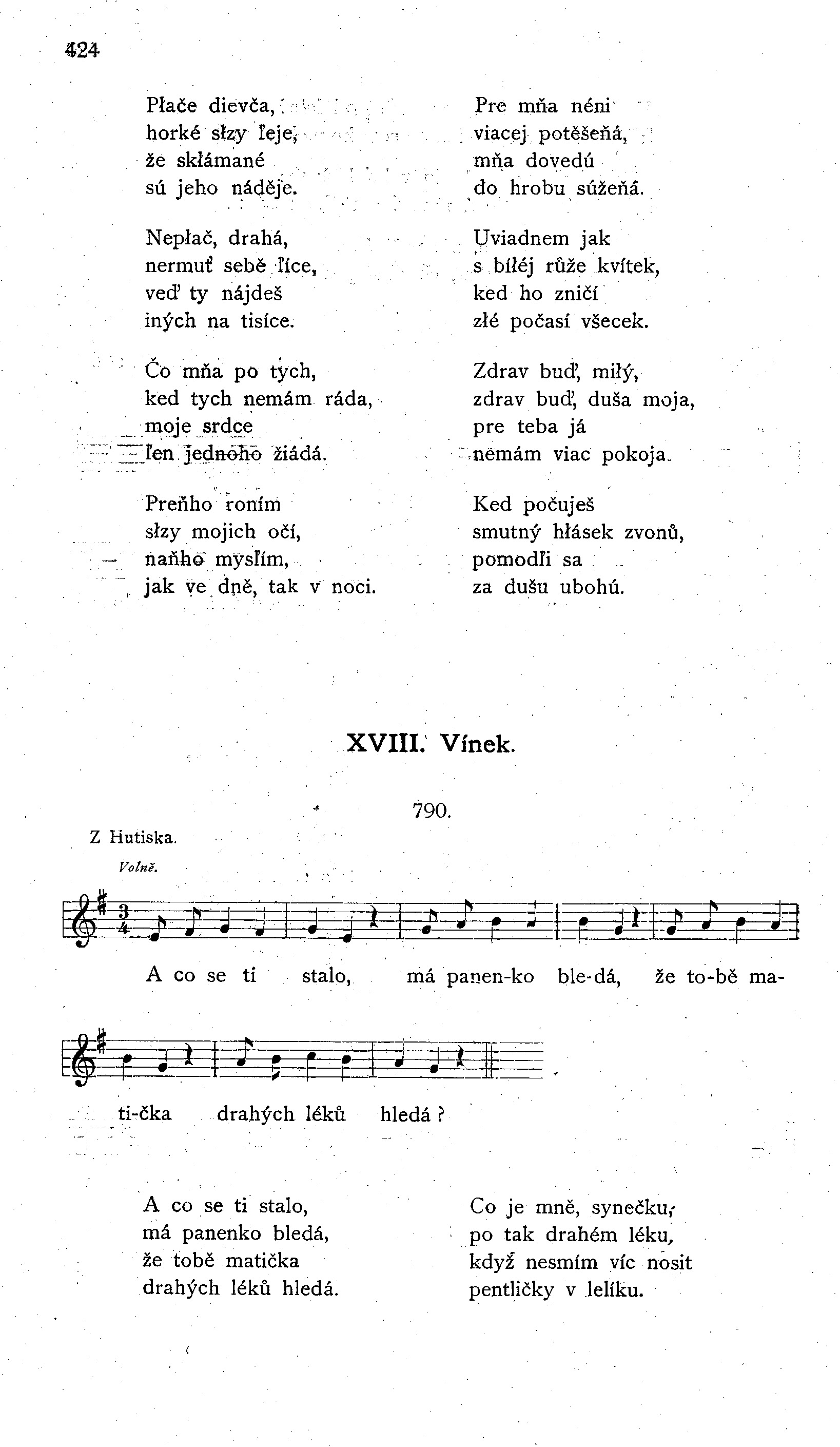 A co se ti stalo, má panenko bledá, že tobě matička drahých léků hledá. Co je mně, synečku, po tak drahém léku, když nesmím víc nosit pentličky v lelíku.
