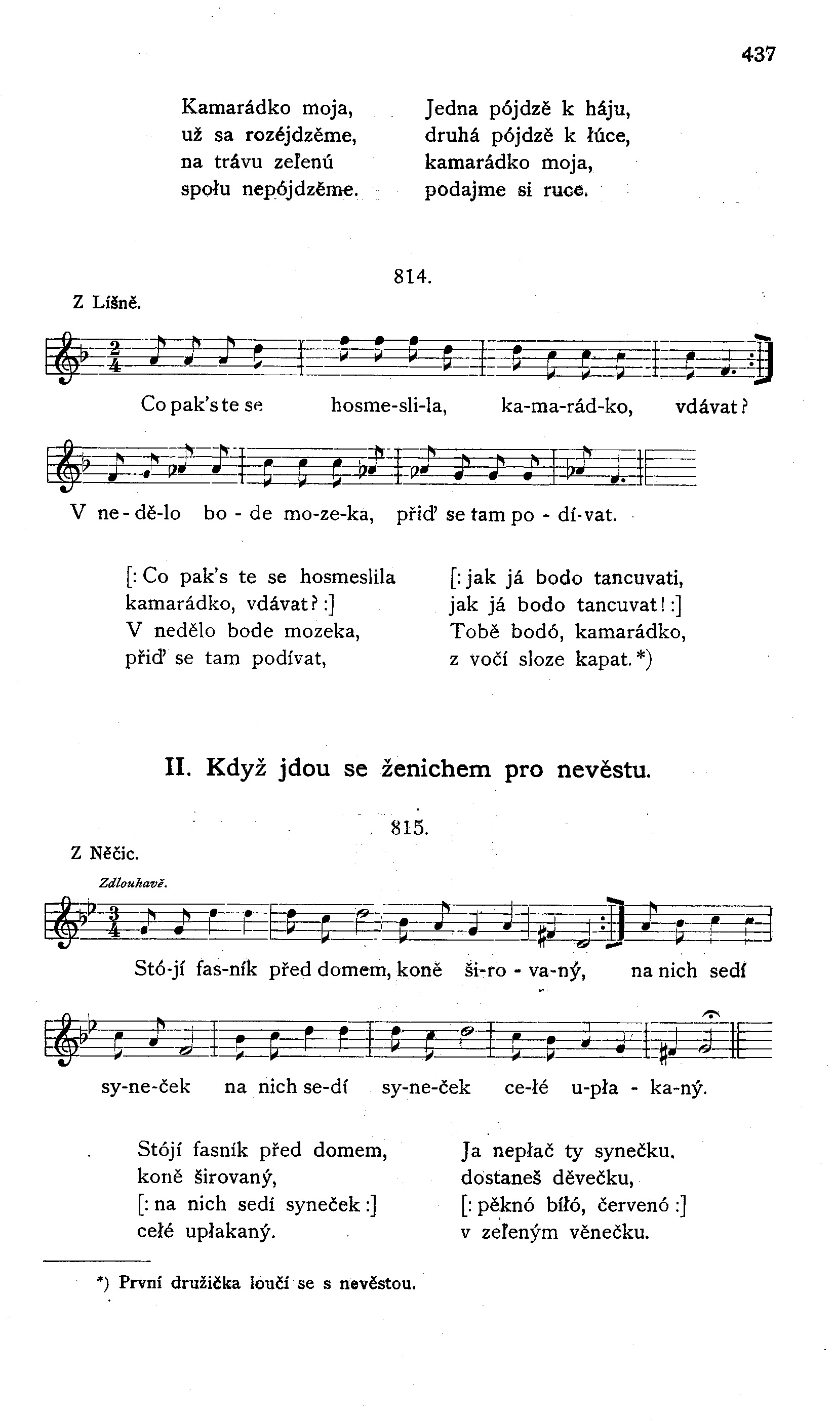 Stójí fasník před domem, koně širovaný, [: na nich sedí syneček :] cełé upłakaný. Ja nepłač ty synečku, dostaneš děvečku, [: pěknó bíłó, červenó :] v zeľeným věnečku.