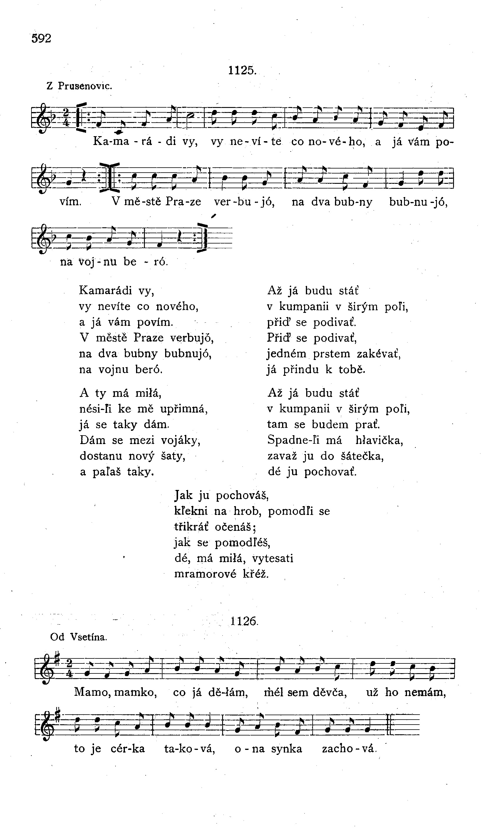 Ani som něvedzěł až dneska týždeň, že já už vojáčkem, vojáčkem budzěm. Trumbaři trúbiľi, kapera hráła, Janko mašerovał, miłá płakała. Nepłač ty, má miłá, nehub si hłavy, víc sa něnavrácím, hołúbku švarný. Ona mi hovoří: muoj pěkný, švarný, na tento šáteček s týma kvietkami. Či budzěš rúbaný, ľebo sekaný, ľen sa ty ucíraj s tými kvietkami.