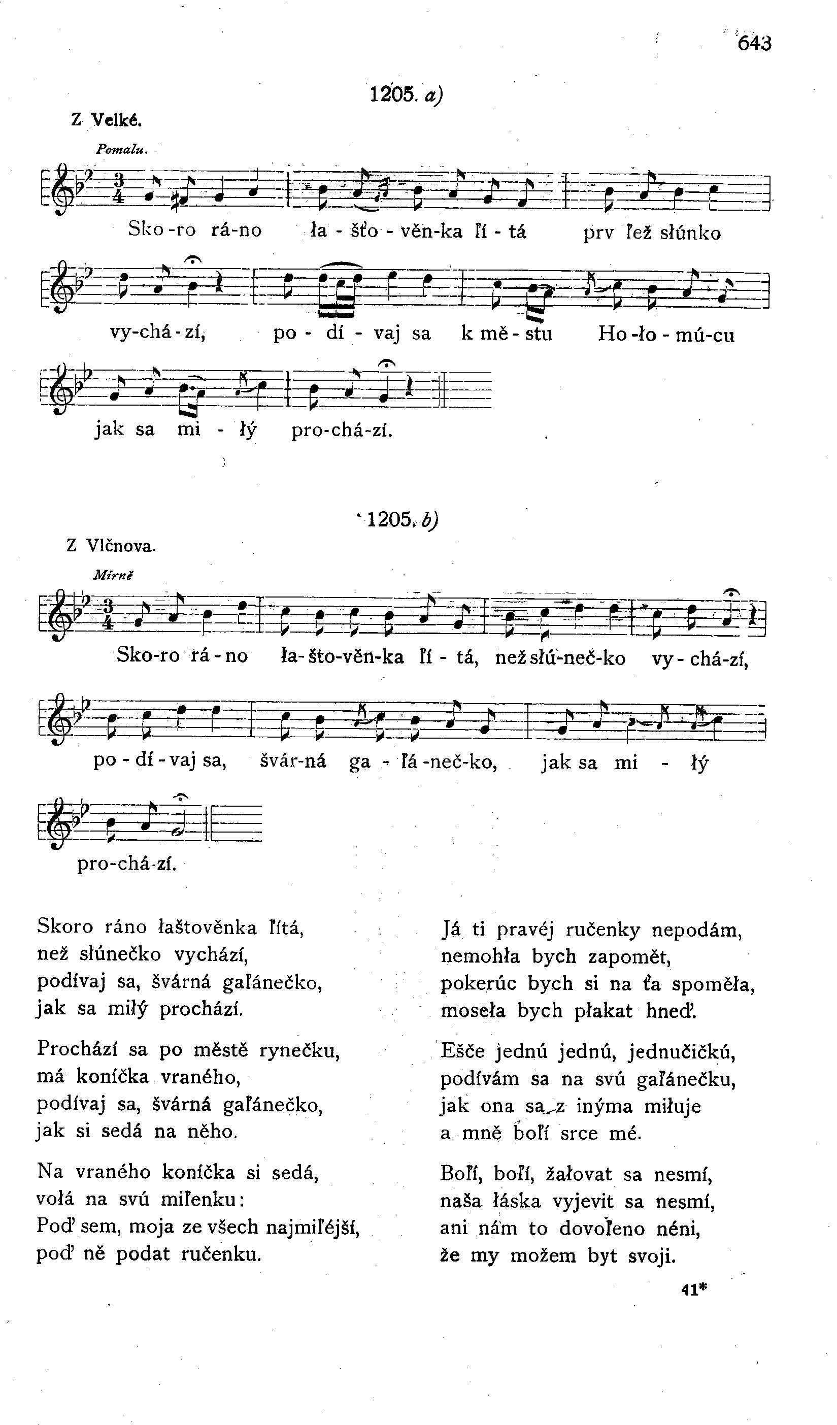 Skoro ráno łaštověnka ľítá, než słúnečko vychází, podívaj sa, švárná gaľánečko, jak sa miłý prochází. Prochází sa po městě rynečku, má koníčka vraného, podívaj sa, švárná gaľánečko, jak si sedá na něho. Na vraného koníčka si sedá, vołá na svú miľenku: Poď sem, moja ze všech najmiľéjší, poď ně podat ručenku. Já ti pravéj ručenky nepodám, nemohła bych zapomět, pokerúc bych si na ťa spoměła, moseła bych płakat hneď. Ešče jednú jednú, jednučičkú, podívám sa na svú gaľánečku, jak ona sa z inýma miłuje a mně boľí srce mé. Boľí, boľí, žałovat sa nesmí, naša łáska vyjevit sa nesmí, ani nám to dovoľeno néni, že my možem byt svoji.