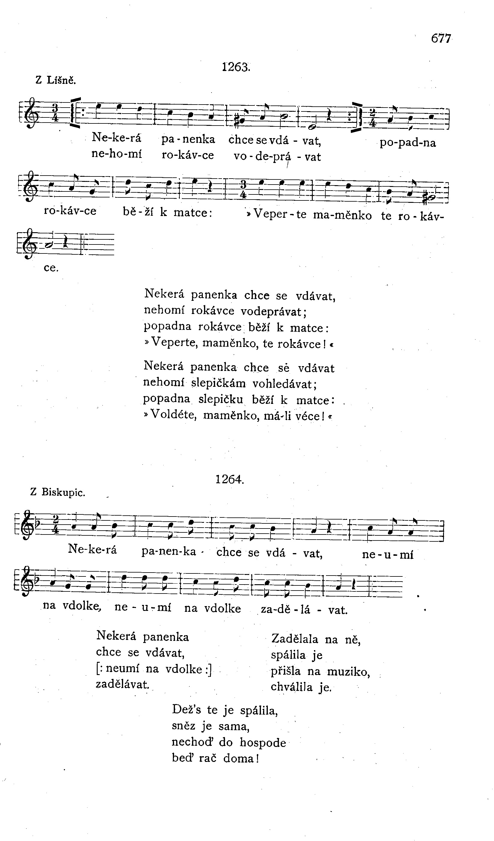 Nekerá panenka chce se vdávat, nehomí rokávce vodeprávat; popadna rokávce běží k matce: »Veperte, maměnko, te rokávce!« Nekerá panenka chce se vdávat nehomí slepičkám vohledávat; popadna slepičku běží k matce: »Voldéte, maměnko, má-li véce!«