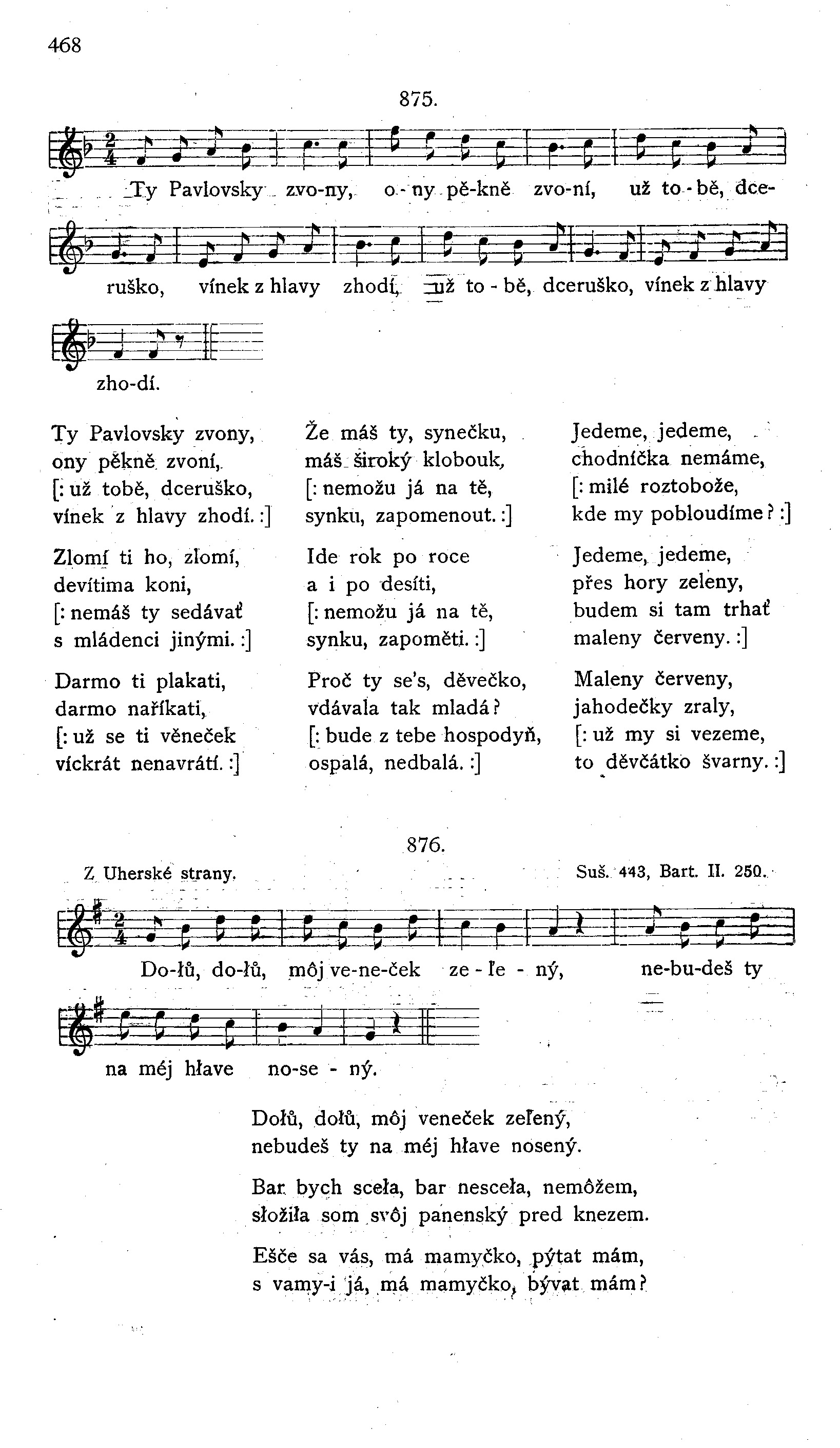 Seděla pod borovičkou, plakala, že má chudičkou kytičku rozmarínovou na zahrádce. Prosila božího deště, aby jí vyrostla ještě kytička rozmarinová na zahrádce. Mladost, radost! ani mně nedají dorost: včera mně minulo patnáct let, už jsem jich přelhala devět. Nedám, nedám, mládenci, to vám povídám, se stromu jablíčka trhali: musíte času čekati. Kdyby bylo nesvítalo, bylo by mi děvče dalo tři hubičky nebo čtyry, to je děvče roztomilý! Už jdou děvčátka z Lomečku, už jdou děvčata z Lomce: mají červeny čepení, mají zeleny věnce. Pověz mně, och má znejmilejší! kudy k vám budu chodit? Vokolo humen je cestička, ta tě k nám bude vodit. Vokolo humen je cestička, je pěkná drnovatá: kdy ty k nám, můj Honzíčku, pří-deš, sedni před naše vrata. Před těma našima vratami je pěknej bílej kámen: kdy ty k nám, můj Honzíčku, přídeš, jenom si sedni na něn. Před těma našima vratami je pěknej kameníček: aby vo tom lidi věděli, že jsi můj milovníček. Šafáři,[19] mlynáři! z vašeho dvora krásná osoba vychází. Jeníčku, bratříčku! nabí flintičku, postřel Aničku na hrázi. Nechám jí, neznám ji: ona mně koupí na pěkný šaty hedbáví. Já jí zas zlatý pás, stříbrný přazky, zlaty podvazky: „Tu máš, Ančičko, zlatá perličko! lásku zas.“ Adámku náš! co pak děláš? na lonce ti pasou,